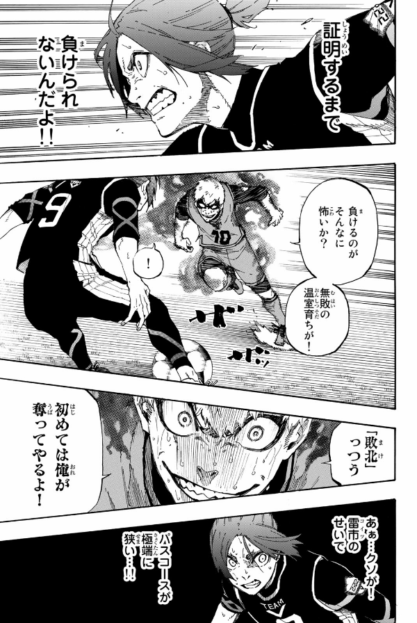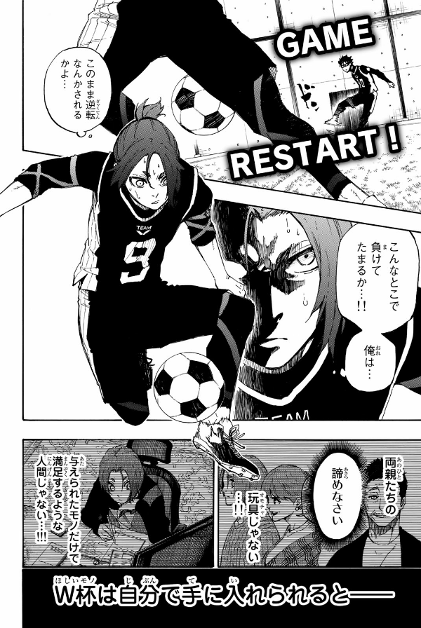 ブルーロック 5 2018年、W杯。日本代表は無残に散った。今大会もベスト16止まり…。アジアでは強豪? 組織力は世界レベル? そんなことは、もう聞き飽きた! 課題は、絶対的な「エースストライカー」の不在。悲願“W杯優勝”のために、ゴールに飢え、勝利に渇き、試合を一変させる革新的な“1人”を作るべく、日本フットボール連合は300人のユース年代の選手達を招集する。まだ無名の高校2年生・潔世一は、己のエゴを以って299人を蹴落とし、最強のエースストライカーの道を駆け上れるか!? 登場人物、全員“俺様”! 史上最もイカれたエゴイストFWサッカー漫画、ここに開幕!! 圧倒的な天才・凪の得点力を誇るチームV相手に、後半15分で3対3に追いついたチームZ。選手たちは次なる次元への“覚醒”を求め、自らのプレーを見つめ直すことに。潔は自分のプレーに潜む「無駄」の正体を解き明かし、強敵からゴールを奪うことができるのか!? 限界を超え、新たな武器でシュートを放て! 死闘・チームV戦、決着!!