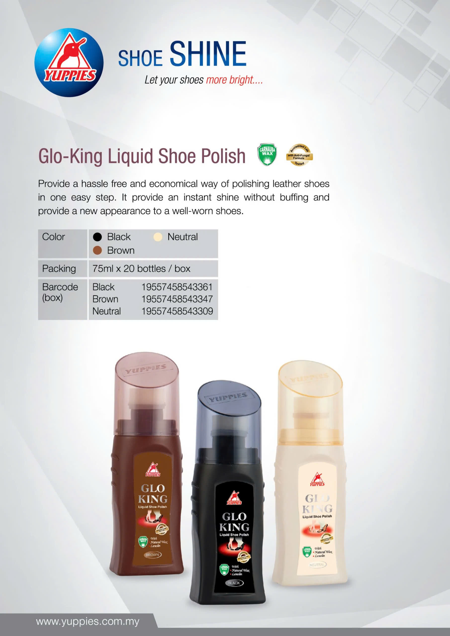 - Xi đánh giày GloKing dạng nước nằm trong chuỗi sản phẩm chăm sóc giày của hãng Yuppies – Malaysia.