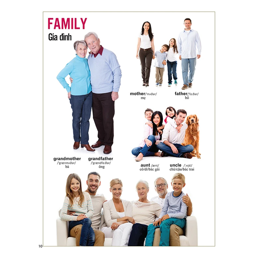 Sách giới thiệu 1000 từ tiếng Anh đầu tiên, bao gồm các từ về người, vật, hành động, màu sắc, con số,... thường gặp trong cuộc sống hàng ngày của trẻ.