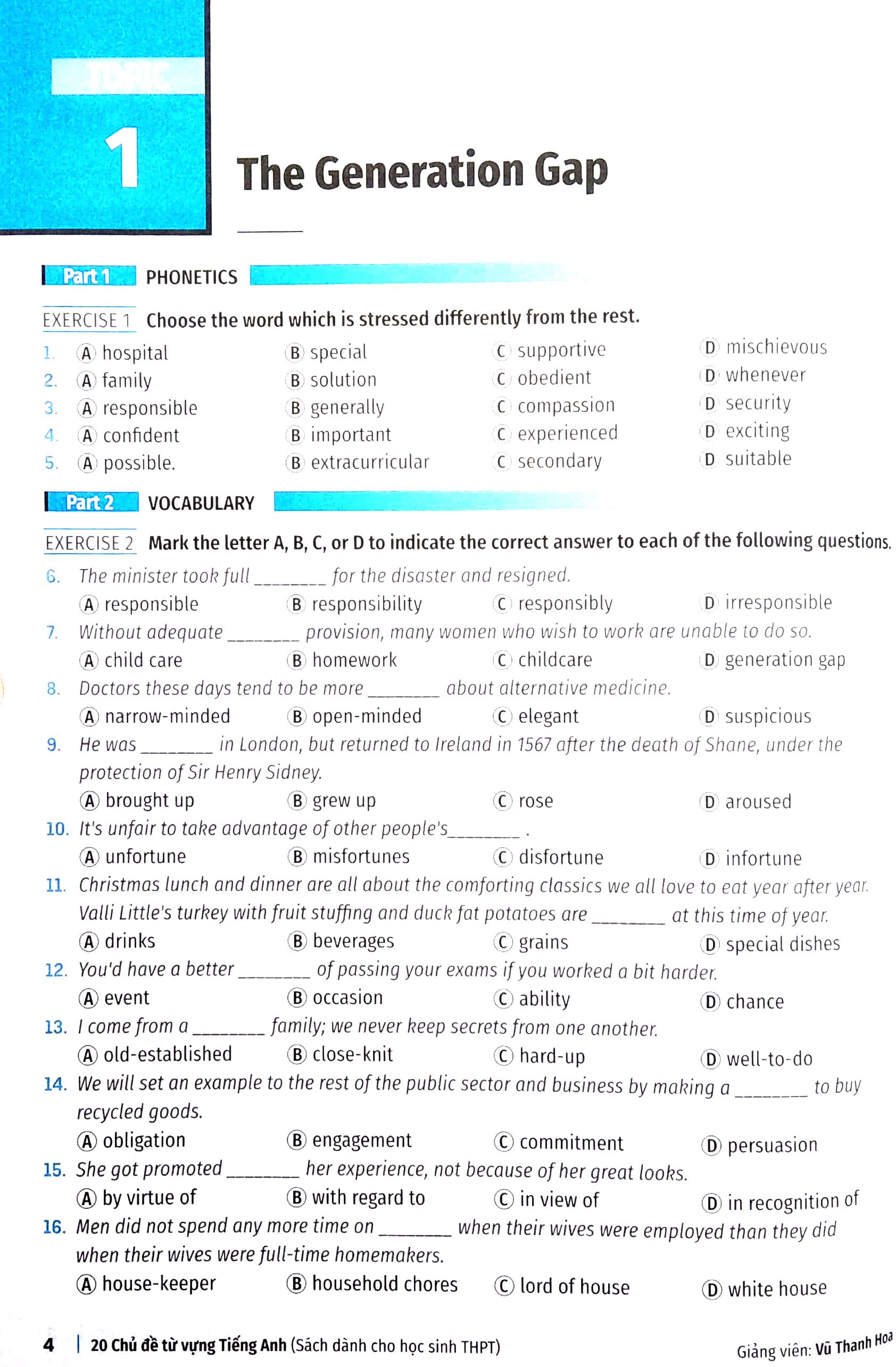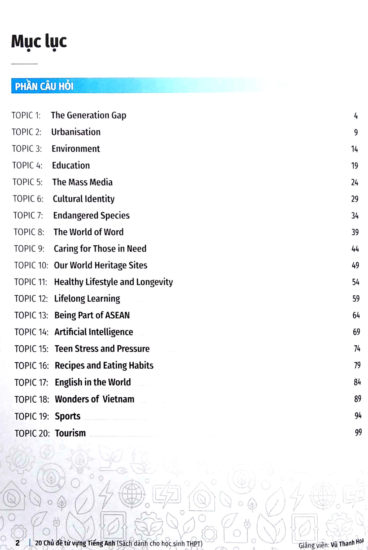 Để đạt điểm cao khi làm bài môn Tiếng Anh trong các kỳ thi tốt nghiệp và tuyển sinh Đại học, Cao đẳng, các em học sinh cần ghi nhớ và nắm vững kiến thức từ vựng, ngữ pháp không chỉ của lớp 12 mà còn xuyên suốt cả chương trình THPT. Chính vì lẽ đó, cô biên soạn cuốn sách này nhằm giúp các em vừa có thể chuẩn bị kiến thức về từ vựng của các bài trong sách học ở trường, vừa nâng cao vốn từ theo từng chủ đề. Trong cuốn sách cô đã tổng hợp 20 chủ đề từ vựng thường gặp trong các bài thi mà học sinh lớp 9 và học sinh THPT cần ghi nhớ. Từ vựng là “xương sống” của ngôn ngữ và trong các bài thi vào Đại học thì từ vựng chiếm 6/10 điểm. Vì thế, các em nhớ dành nhiều thời gian với cuốn sách “20 chủ đề từ vựng tiếng Anh” nhé.
