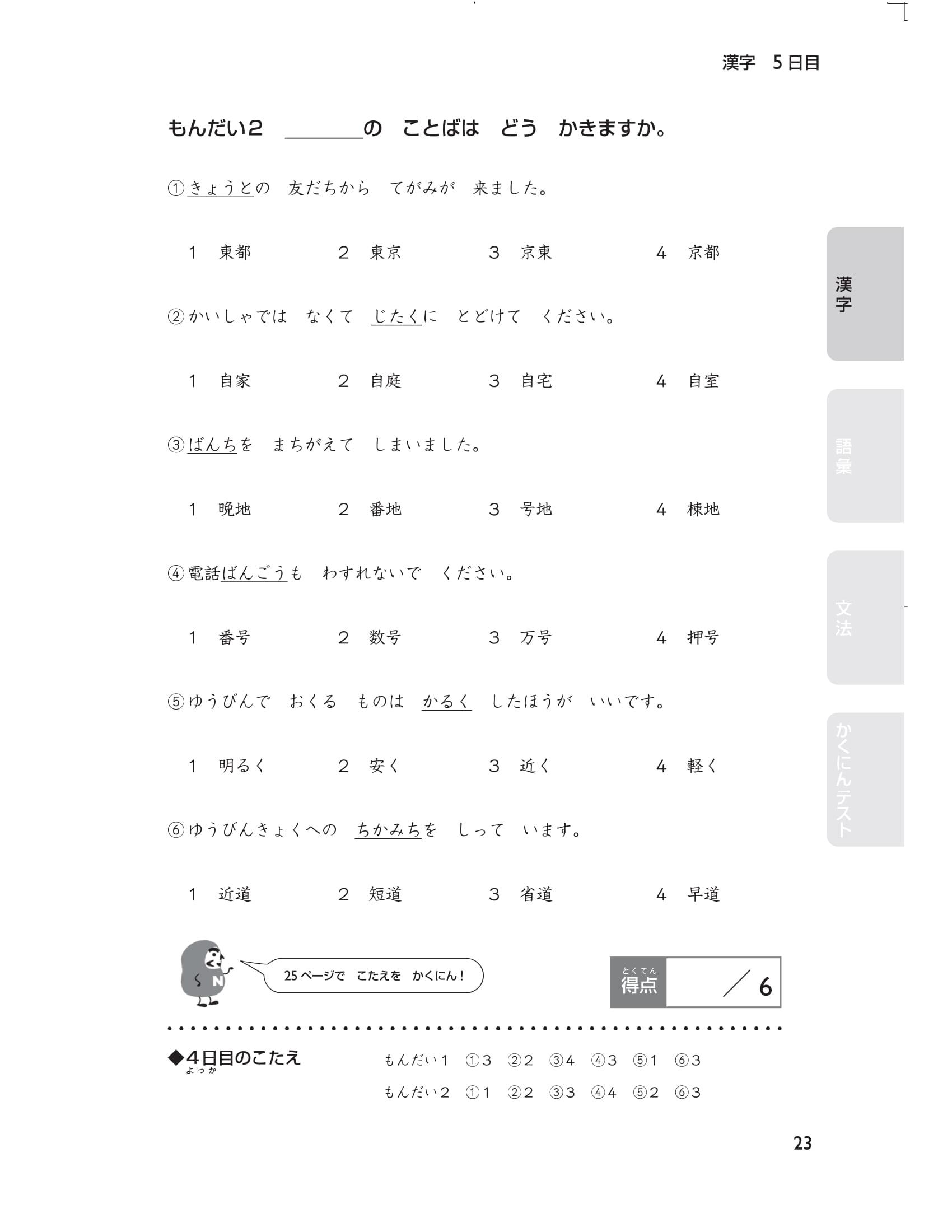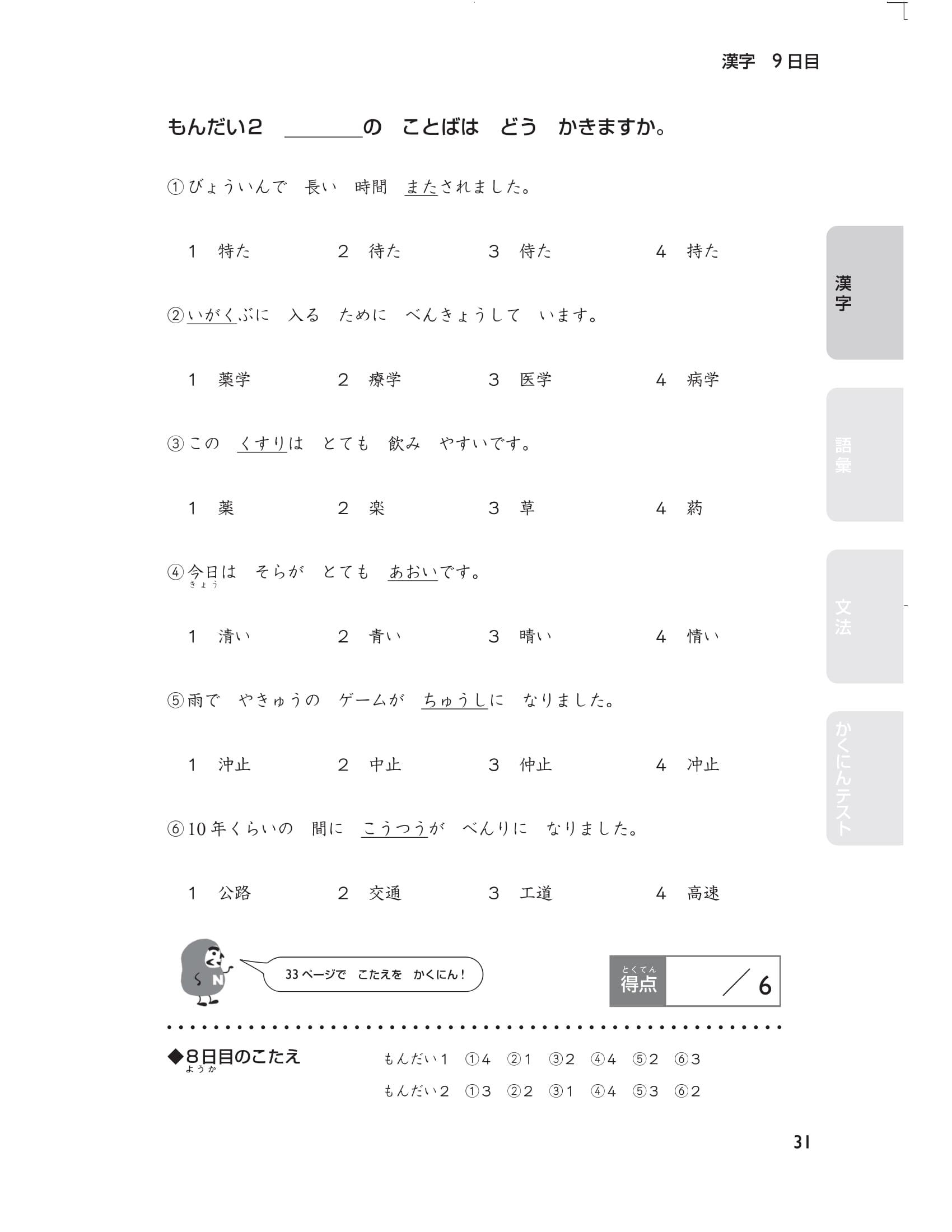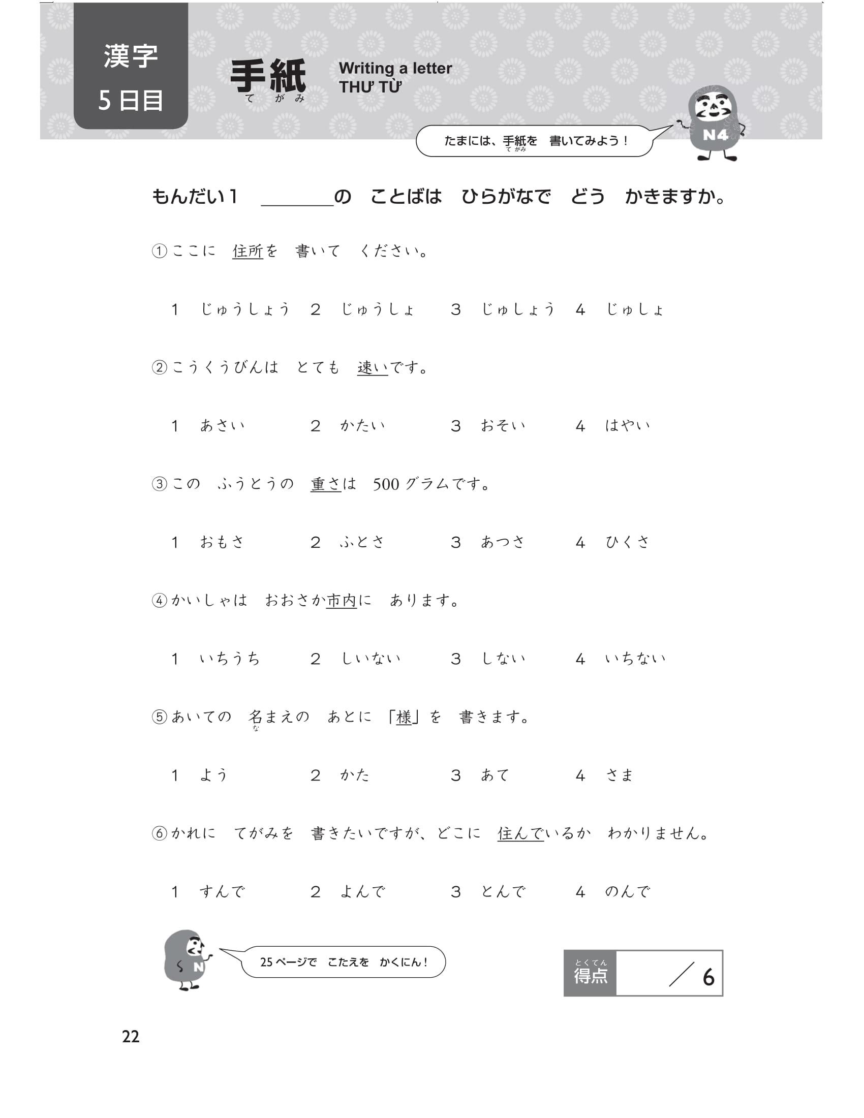 Cuối cùng, có 5 bài thi thử (tổng cộng 40 câu hỏi) mô phỏng đề thi năng lực tiếng Nhật. Thử thách bản thân ngay trước kỳ thi bằng cách xem lại nhiều lần những chỗ mình đã sai ( thứ tự các phần trong đề thi chính thức là chữ Hán, từ vựng và cuối cùng là ngữ pháp) bạn nhé. Hãy sử dụng cuốn sách này một cách hiệu quả Chúng tôi đã chuẩn bị rất nhiều câu hỏi để các bạn có thể luyện tập trong 15 ngày theo thứ tự các phần: chữ Hán, từ vựng, ngữ pháp. Hơn nữa, thông qua bảng checklist bạn có thể dễ dàng phân bổ số lượng câu hỏi nên làm trong một ngày và sắp xếp kế hoạch học tập cho đến thời điểm thi sao cho phù hợp.