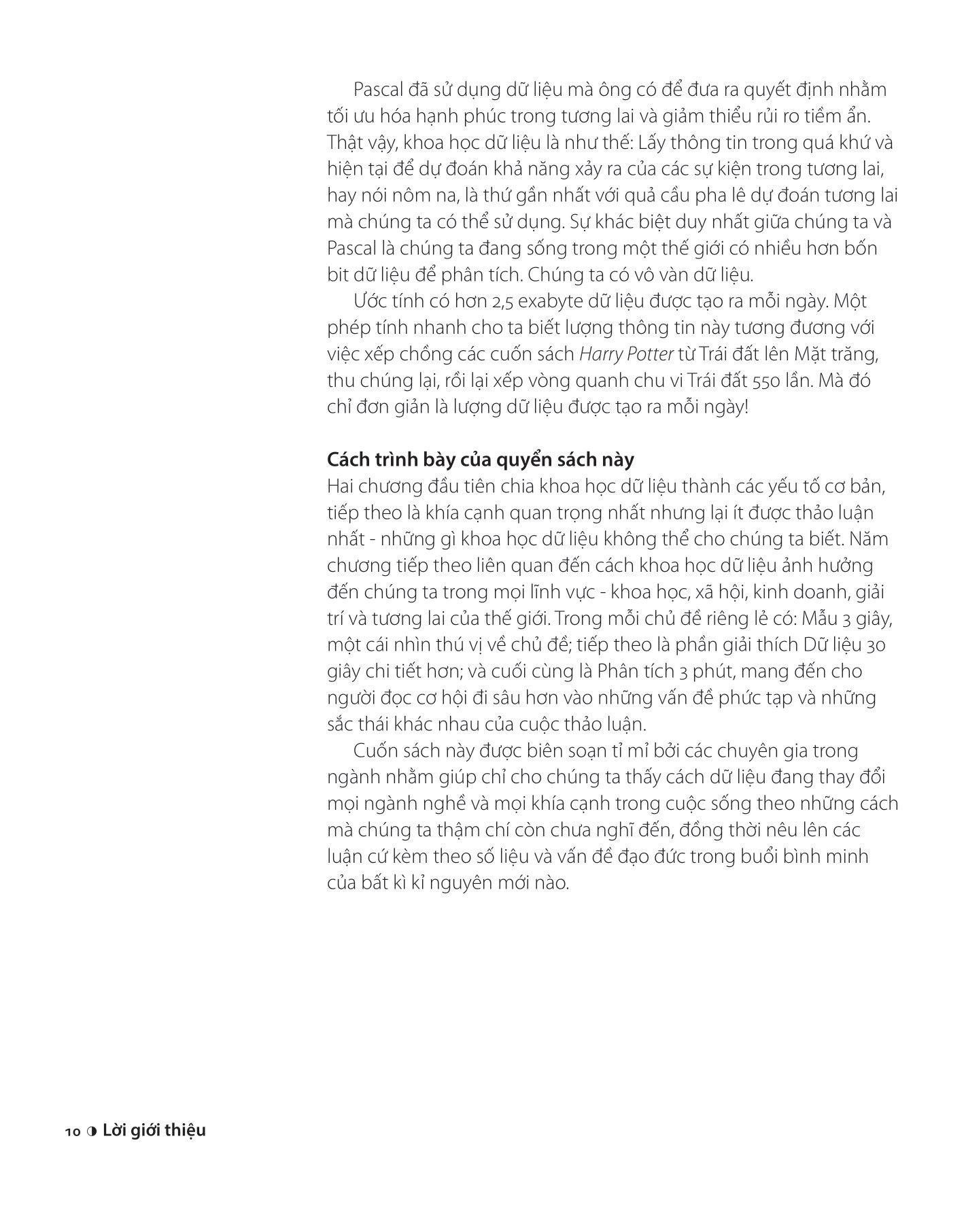 30 Giây Khoa Học - 30 Giây Khoa Học Dữ Liệu Khoa học dữ liệu (Data science) là một hệ sinh thái nhân tạo mới trong kỉ nguyên thông tin hiện đại, bao gồm từ việc tìm ra tội phạm đến dự đoán dịch bệnh. Nhưng bạn có biết rằng nó không phải chỉ là lượng thông tin khổng lồ được thu thập bởi máy tính, điện thoại thông minh và thẻ tín dụng? 30 Giây Khoa học dữ liệu bao gồm các nguyên tắc thống kê cơ bản thúc đẩy các thuật toán và cách thức dữ liệu ảnh hưởng đến chúng ta trong mọi lĩnh vực khoa học, xã hội, kinh doanh, giải trí - cùng với các vấn đề đạo đức và lời hứa về một thế giới tốt đẹp hơn trong tương lai. Mỗi đoạn văn 30 giây trình bày chi tiết một khía cạnh của khoa học dữ liệu chỉ trong khoảng 300 từ và một hình minh họa, miêu tả làm thế nào để thu thập các loại dữ liệu khác nhau và sử dụng các chương trình máy tính để tìm ra các qui luật mà mắt người không thể phát hiện ra, góp phần làm thay đổi thế giới. Tìm hiểu những ý tưởng và tiểu sử của những vĩ nhân đằng sau chúng, 30 giây Khoa học dữ liệu là cách nhanh nhất để khám phá cách dữ liệu ảnh hưởng mạnh mẽ đến các vấn đề lớn như biến đổi khí hậu, chăm sóc sức khỏe và cả những chi tiết nhỏ trong cuộc sống hàng ngày của chúng ta. Liberty Vittert là Giáo sư Khoa học Dữ liệu tại Trường Olin Business thuộc Đại học Washington, St Louis. Với tư cách là đại sứ của Hiệp hội Thống kê Hoàng gia, nữ chuyên gia của BBC và là thành viên được bầu chọn của Viện Thống kê Quốc tế, Liberty làm việc hết m.ình để phổ cập Khoa học thống kê và dữ liệu đến cho công chúng. Cô cũng là Phó biên tập cho Tạp chí Harvard Data Science Review và là thành viên Hoa Kì trong Hội đồng quản trị của Tổ chức Người tị nạn Liên hợp quốc (UNHCR).