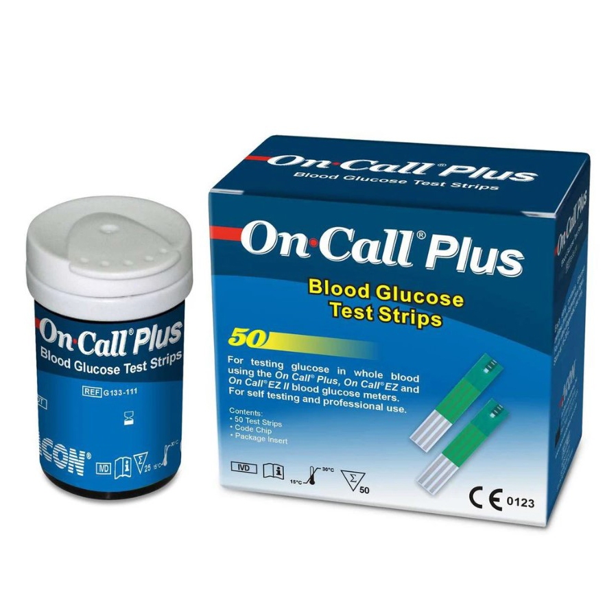 - Tên sản phẩm: Que thử đường huyết ON-CALL Plus (2 lọ, mỗi lọ 25 que)