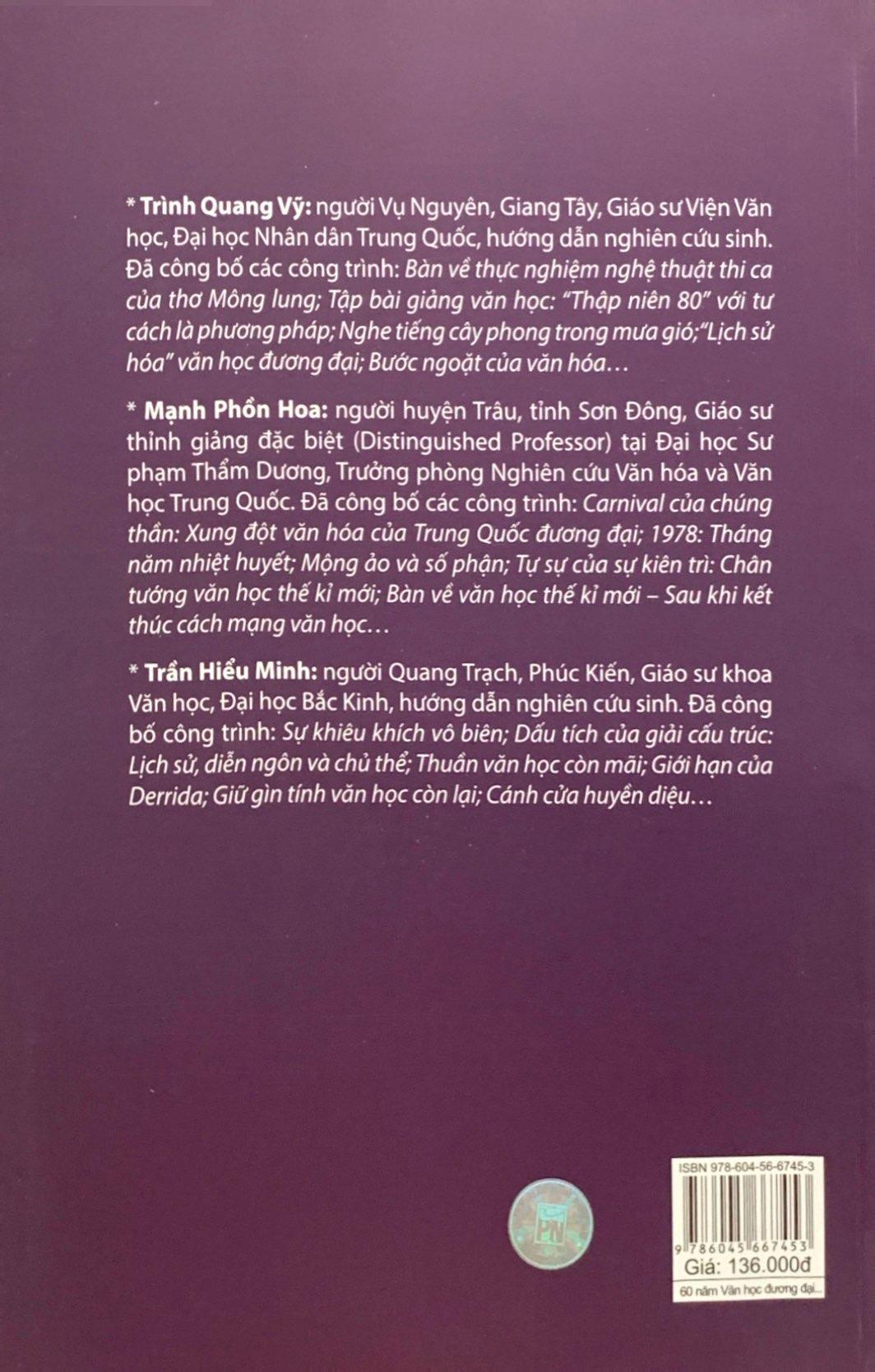 60 năm văn học đương đại Trung Quốc là công trình nghiên cứu văn học công phu của 3 tác giả Trình Quang Vỹ, Mạnh Phồn Hoa, Trần Hiểu Minh, những giáo sư văn học hàng đầu Trung Quốc, về lịch sử phát triển của văn học Trung Quốc suốt 6 thập kỷ kể từ năm 1949. Đây chắc chắn là một tài liệu tham khảo hữu ích cho những ai muốn quan tâm đến dòng chảy văn chương nhiều thác ghềnh và lắm thăng trầm ở quốc gia đông dân nhất thế giới này.