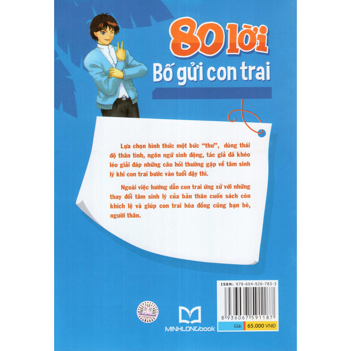 80 lời bố gửi con trai là những bức tâm thư bố gửi cho con trai, để cùng con đối diện với giai đoạn đặc biệt của tuổi dậy thì, giai đoạn mà một cậu con trai cần phải trải qua để trở thành một người đàn ông thực thụ.