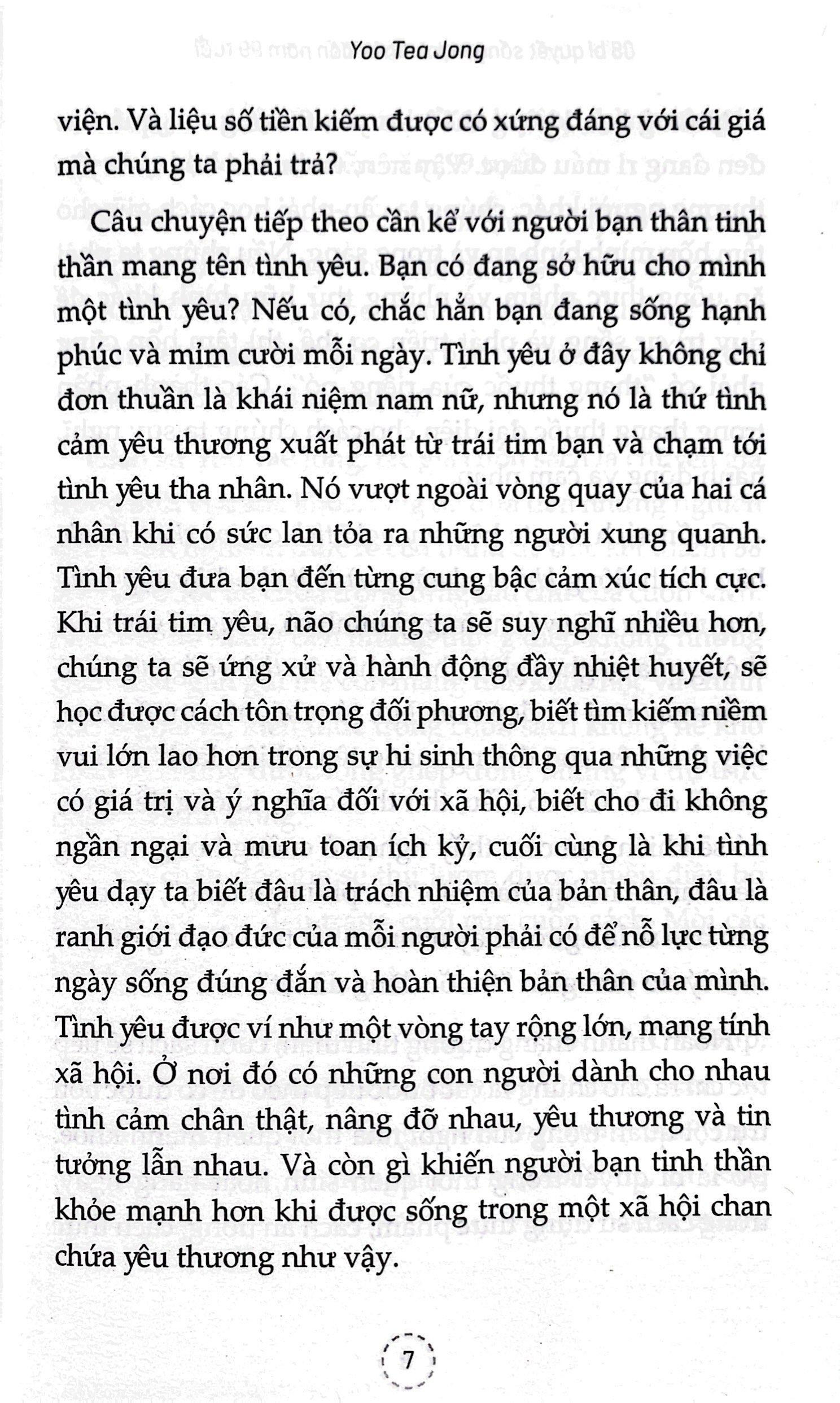 Câu chuyện tiếp theo cần kể với người bạn thân tinh thần mang tên tình yêu. Bạn có đang sở hữu cho mình một tình yêu? Nếu có, chắn hẳn bạn đang sống hạnh phúc và mỉm cười mỗi ngày. Tình yêu ở đây không chỉ đơn thuần là khái niệm nam nữ, nhưng nó là thứ tình cảm yêu thương phát xuất từ trái tim bạn và chạm tới trái tim tha nhân. Nó vượt ngoài vòng quay của hai cá nhân khi có sức tỏa lan ra những người xung quanh. Tình yêu đưa ra đến từng cung bậc cảm xúc tích cực. Khi tim ta yêu, não ta sẽ suy nghĩ nhiều hơn, ta sẽ ứng xử và hành động đầy nhiệt huyết, sẽ học được cách tôn trọng đối phương, biết tìm kiếm niềm vui lớn lao hơn trong sự hi sinh thông qua những việc có giá trị và ý nghĩa đối với xã hội, biết cho đi không ngần ngại và mưu toan ích kỷ, cuối cùng là khi tình yêu dạy ta biết đâu là trách nhiệm của bạn thân, đâu là ranh giới đạo đức của mỗi người phải có để ta nỗ lực từng ngày sống đúng đắn và hoàn thiện bản thân của mình. Tình yêu có thể được ví như một vòng tay rộng lớn, mang tính xã hội. Ở nơi đó có những con người dành cho nhau tình cảm chân thật, nâng đỡ nhau, yêu thương và tin tưởng lẫn nhau. Và còn gì khiến người bạn tinh thần khỏe mạnh hơn khi được sống trong một xã hội chan chứa yêu thương như vậy.