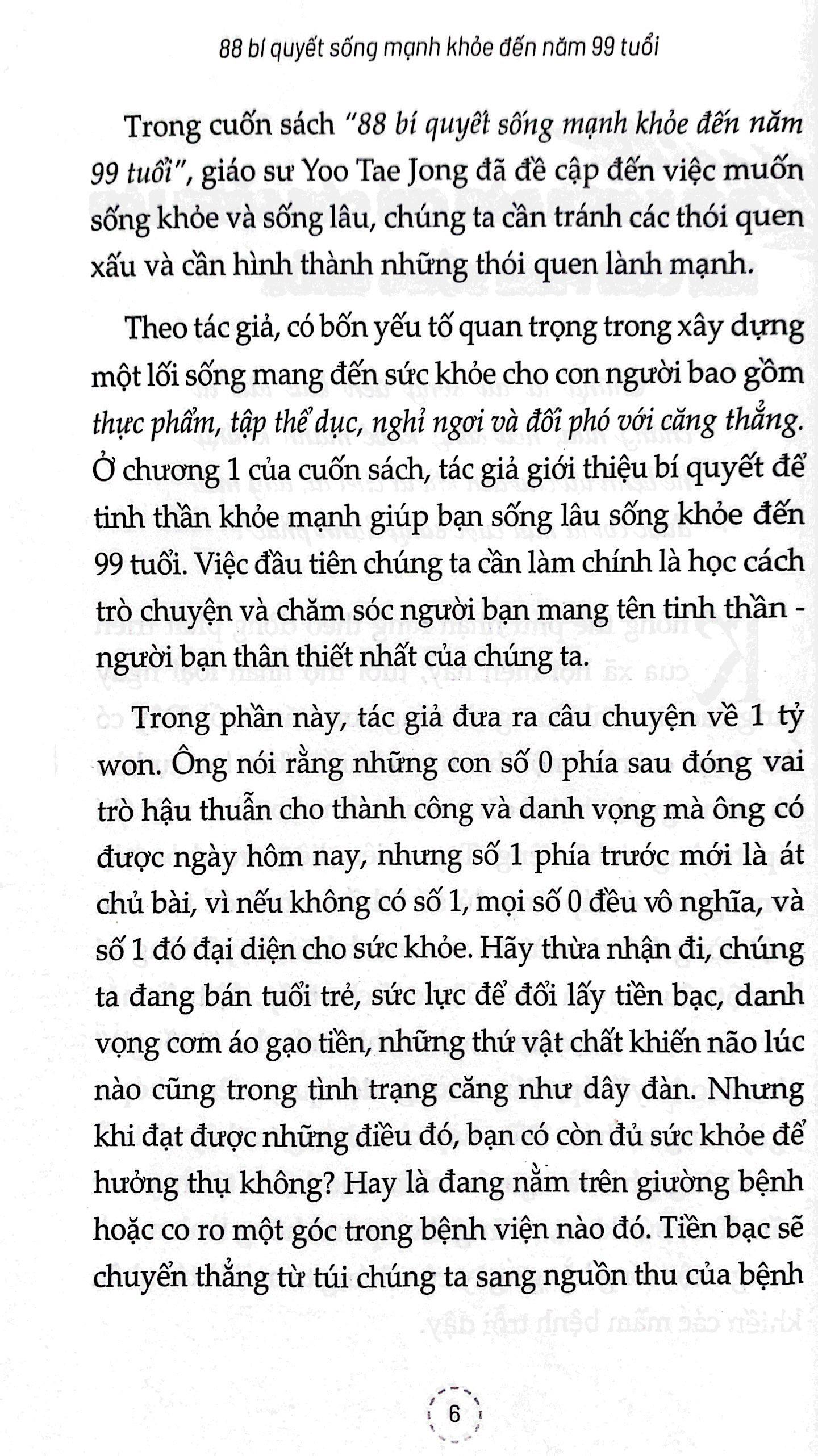 Nhưng bạn không thể trao yêu thương với quả tim đen đang rỉ máu được. Vậy nên, trước khi học biết yêu thương người khác, chúng ta cần phải học cách giữ cho tâm hồn mình bình an và trong sáng. Nếu người ta phải ăn uống thực phẩm và những thứ hữu hình khác để duy trì sự sống và phát triển cơ thể, thì tâm hồn cũng phải có “thang thuốc của riêng nó”. Các thành phần trong thang thuốc đại diện cho cách chúng ta suy nghĩ, hành động và cảm nhận. Cuốn sách dạy ta hãy suy nghĩ tích cực và chân thành, hãy hành động khiêm nhường và thật thà, hãy tập bằng lòng và thỏa mãn với những gì mình có, đừng cố ganh đua thông qua sự ghen ghét nhưng hãy âm thầm cố gắng để có một ngày mai tốt đẹp hơn. Nói tóm lại, nếu muốn đua, hãy đua trên con đường mang tên “thiện lành”, và nỗ lực về đích. Chỉ có điều, thứ thuốc này không dễ uống, nó sẽ khiến bạn cảm thấy nghẹn ở cuống họng, nhưng nếu bạn để nó kịp tràn vào “lục phủ ngũ tạng”, thì chắc hẳn bạn sẽ là người chạy nhanh nhất trên đường đua, vì một lý do đơn giản “thuốc đắng dã tật”. Hoàn thành chặng đường tinh thần, cuốn sách sẽ tiếp tục chỉ ra cho chúng ta các bước tiếp theo để có được bốn trụ cột quan trọng của ngôi nhà thói quen mạnh khỏe. Đó là bí quyết trong thói quen sinh hoạt hằng ngày, trong cách sử dụng thực phẩm, cách ăn uống, cách thức vận động cơ thể để bạn có thể “tu luyện” thành công bí kíp sống khỏe mạnh đến năm 99 tuổi.