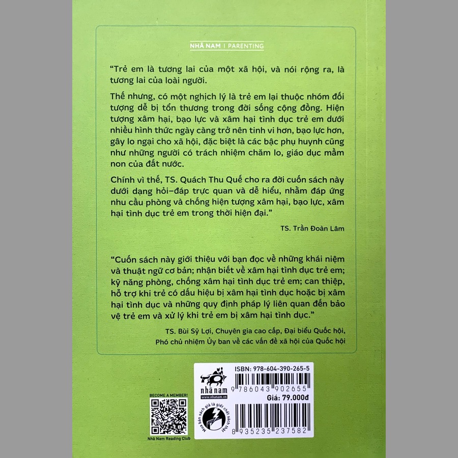 • "Cuốn sách này giới thiệu với bạn đọc về những khái niệm và thuật ngữ cơ bản; nhận biết về xâm hại tình dục trẻ em; kỹ năng phòng, chống xâm hại tình dục trẻ em; can thiệp, hỗ trợ khi trẻ có dấu hiệu bị xâm hại tình dục hoặc bị xâm hại tình dục và những quy định pháp lý liên quan đến bảo vệ trẻ em và xử lý khi trẻ em bị xâm hại tình dục." TS. Bùi Sỹ Lợi, Chuyên gia cao cấp, Đại biểu Quốc hội, Phó chủ nhiệm Ủy ban về các vấn đề xã hội của Quốc hội