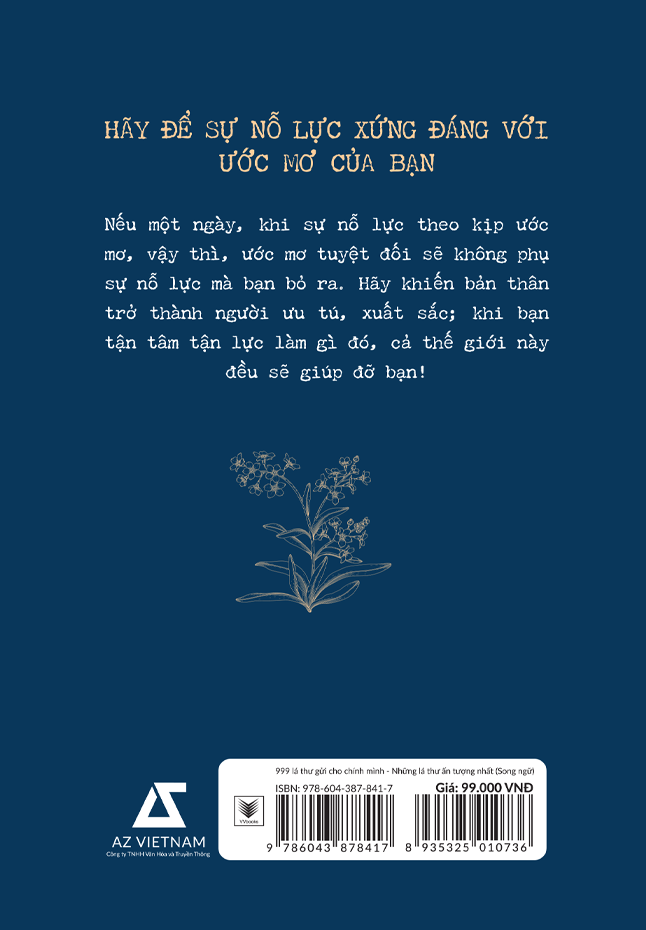 Theo dòng chảy hối hả của cuộc sống hiện nay – khi mỗi một ngày đều trôi qua nhanh chóng nhưng chẳng đọng lại được điều gì thì việc viết lách hay nhắn nhủ những lời tâm tình cho nhau càng trở thành một điều xa xỉ, dường như chẳng mấy ai nguyện làm. Nhưng không sao hết, đã có “999 lá thư gửi cho chính mình” – với Phiên bản chọn lọc, tổng hợp lại những lá thư hay nhất, những lá thư ý nghĩa nhất, chất chứa nội hàm, khả năng chữa lành cao sẽ thay những lá thư tay nói lên những điều bạn muốn giãi bày mà không thể cất tiếng, những điều trong lòng bạn chẳng biết thổ lộ với ai, cùng banj tìm lại ý nghĩa cuộc sống, tìm lại bản thân, tìm lại cả ước mơ và nhiệt huyết mà bạn đã lỡ đánh rơi trên con đường trưởng thành vội vã.