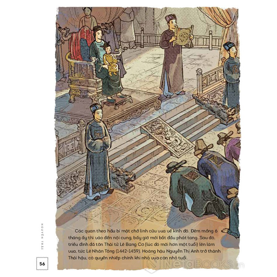 Hình ảnh minh họa sinh động: Các bức tranh, bản đồ và đồ họa trong sách giúp người đọc dễ dàng hình dung ra các sự kiện lịch sử và cuộc sống của Nguyễn Trãi.