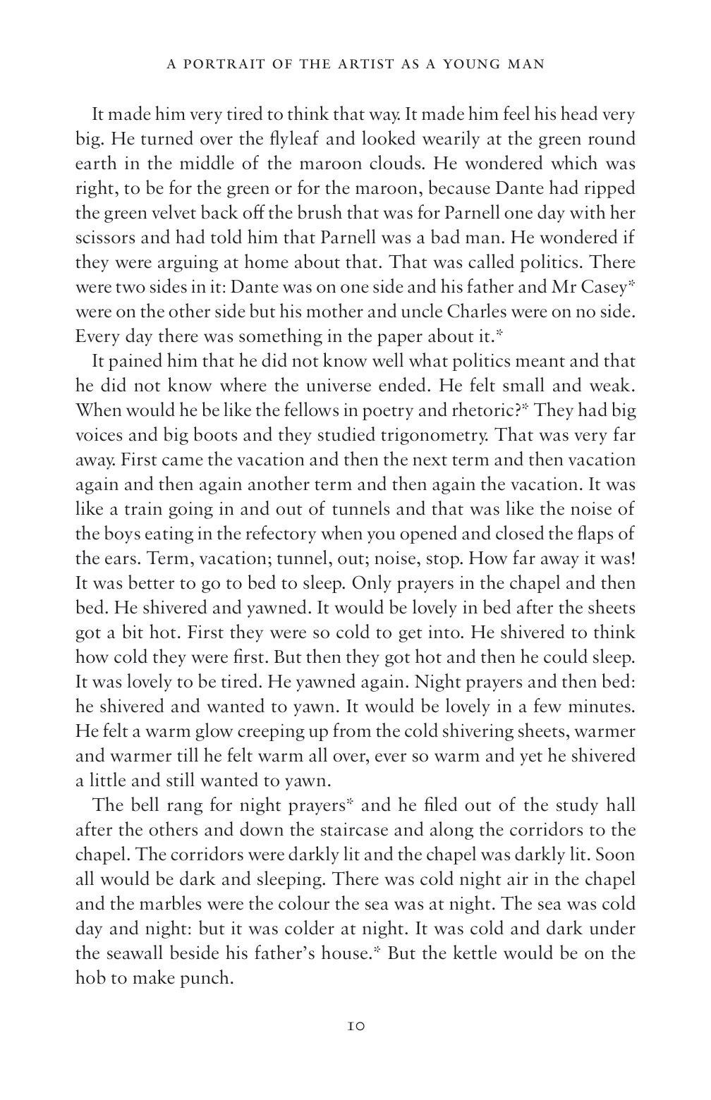 James Joyce's first novel, A Portrait of the Artist as a Young Man is a Ku¨nstlerroman which chronicles the emotional and intellectual development of Stephen Dedalus – a character partly based on the author himself – from his early childhood and his school and university days all the way to his first forays as a young artist. Dedalus's thoughts and epiphanies reveal the tensions, insecurities and feelings of guilt that are the product of living in a country and period so deeply divided along religious and political lines.