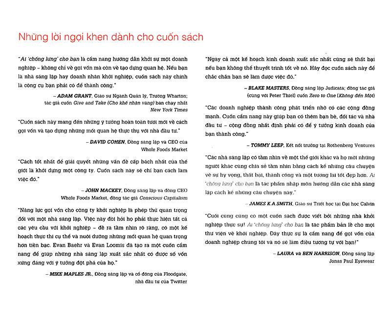 Nhưng không giống như các cuốn sách thấm đẫm lý thuyết của các chuyên gia từng xuất bản, Ai "chống lưng" cho bạn sẽ trang bị cho bạn những kiến thức căn bản nhất về gọi vốn, cùng với đó là bí quyết của 15 doanh nhân đã gọi vốn thành công, bao gồm cả những bài thuyết trình mà họ đã sử dụng để thể hiện trước các nhà đầu tư. Đó thực sự là những kho báu không dễ gì tiếp cận và chưa cuốn sách nào làm được.