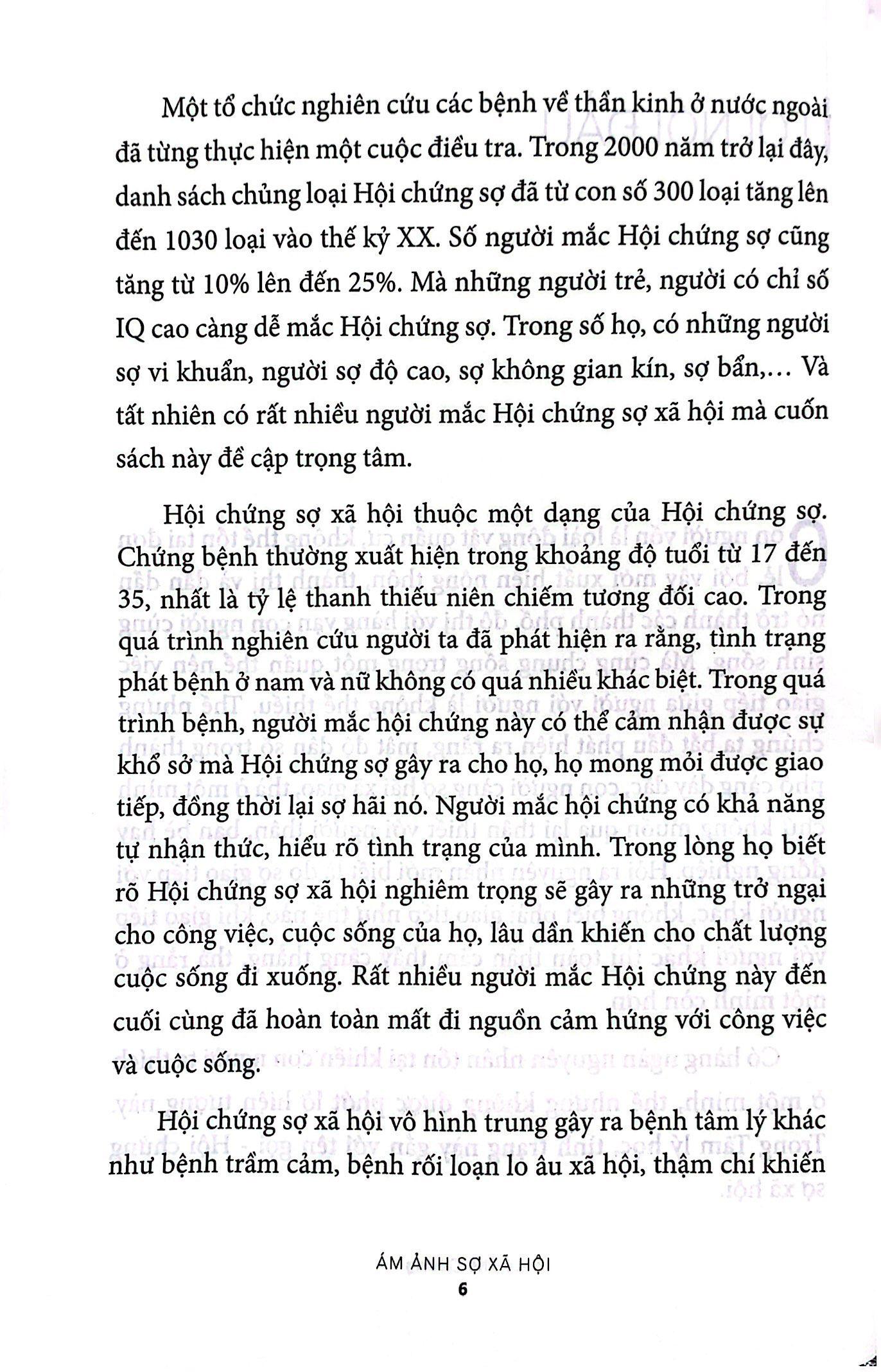 Ám Ảnh Sợ Xã Hội - Chạy Trốn Hay Đối Mặt Hội chứng sợ xã hội đã trở thành một “căn bệnh của thời đại”. Ngày nay tuy mật độ dân số trong thành phố dày đặc nhưng con người ngày càng sợ hãi xã giao, họ sẵn sàng lựa chọn ở một mình thay vì qua lại thân thiết với người thân, bạn bè hay đồng nghiệp. Với lý do chính là sợ giao tiếp với người khác, không biết giao tiếp như thế nào, khi cần giao tiếp thì toàn thân cảm thấy căng thẳng, bồn chồn. Lâu dần họ trở nên mặc cảm, tự ti với chính mình. Có hàng ngàn nguyên nhân tồn tại khiến con người thích ở một mình, tuy nhiên đây cũng là một hiện tượng khá quan ngại. Đặc biệt, trong Tâm lý học, tình trạng này được nhắc đến với tên gọi - “Hội chứng sợ xã hội”. Hội chứng này thường kéo theo các bệnh tâm lý khác như trầm cảm, rối loạn lo âu xã hội, thậm chí có thể nặng nề tới mức gây ảnh hưởng tới việc đi làm, đi học hoặc trong các hoạt động đời sống hàng ngày. Việc tự nhốt mình trong phòng cũng được coi là 1 phương pháp có tác dụng, thế nhưng, tuyệt đối không phải cách giải quyết tối ưu. Dẫu sao một con người cũng không thể nào đoạn tuyệt xã giao với người khác. Vậy nên, cuốn sách “Ám ảnh sợ xã hội - Chạy trốn hay đối mặt” sẽ là giải pháp dành cho những người đã, đang và có thể chưa hiểu rõ về “Hội chứng sợ xã hội”. Cuốn sách sẽ mang đến cho bạn những cái nhìn tổng quát, kết hợp lý thuyết với thực tế, phân tích sự khác biệt giữa lo âu, lo sợ thông thường với “Hội chứng sợ”. Hy vọng mọi thắc mắc của bạn có thể được làm sáng tỏ. Từ đó, các bạn có thể sẵn sàng bước ra khỏi bức màn khép kín, thành thạo mọi trường hợp xã giao, để cuộc sống bước lên đỉnh cao huy hoàng!