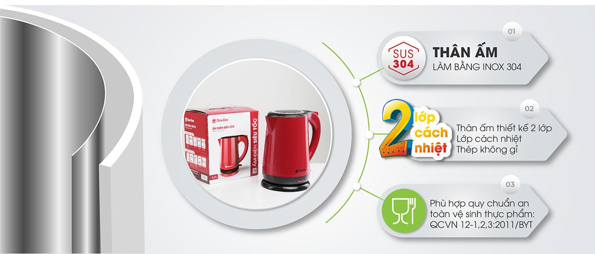 - Thân ấm được làm bằng Inox 304 cao cấp 2 lớp có tính thẩm mĩ cao và không phản ứng hóa học dù ở nhiệt độ cao và an toàn thực phẩm cho người sử dụng