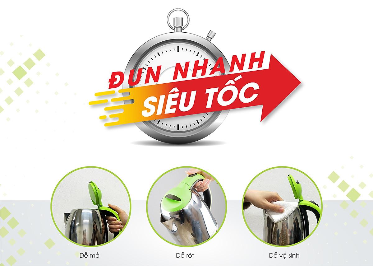 Bình đun siêu tốc thiết kế hiện đại, đun nước nhanh với công suất lớn Chất liệu ruột bình inox SUS 304 cao cấp cho cảm giác sang trọng, chống bám bẩn, dễ dàng vệ