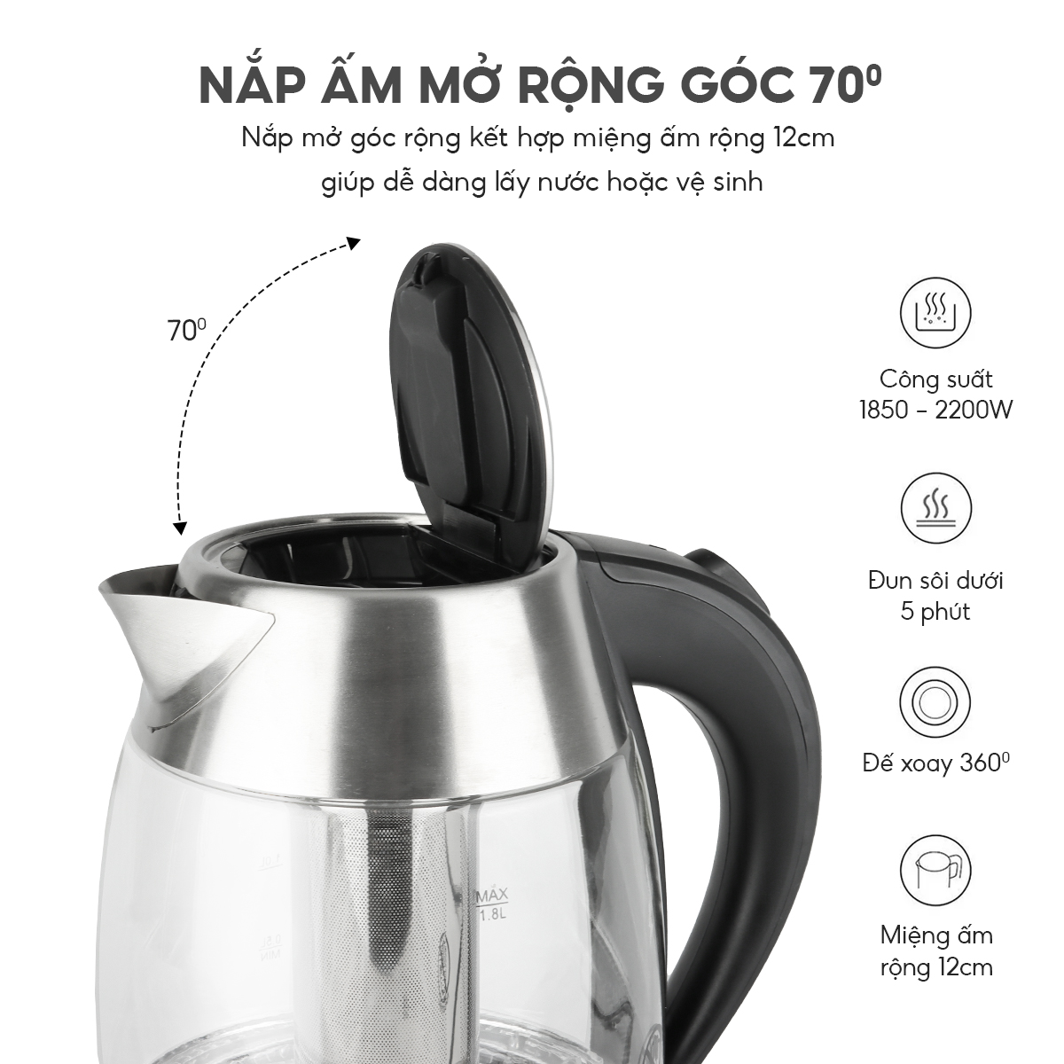 Đặc điểm nổi bật: Thiết kế sang trọng, hiện đại với màu sắc trang nhã Công suất 1800W đun sôi mạnh mẽ, nhanh chóng Dung tích 1.8 lít đủ phục vụ nhu cầu của cả
