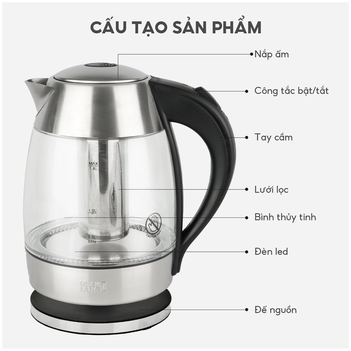 Ấm siêu tốc LEBENLANG LBL2879 bằng thủy tinh chịu nhiệt - hành chính hãng      - Dung tích: 1.7L - Công suất: 1850W-2200W - Chất liệu: Thủy tinh, Inox, nhựa PP cao cấp. Không