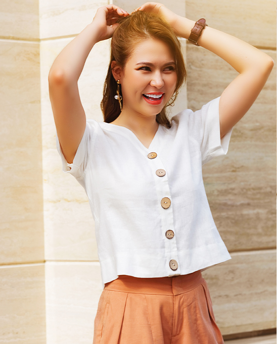Áo Croptop Linen Calla TOP168 Thời trang thiết kế Hity Kiểu dáng áo croptop ngắn ngang lưng quần (vừa qua eo) Cổ V không ve Tay ngắn, lật bảng lai tay Cài bằng nút gỗ phía trước CHẤT LIỆU Linen Cắt may thủ công tinh tế tại Nha Trang, Việt Nam Linen hay Lanh là một trong những chất liệu lâu đời nhất ở trên thế giới. Tên gọi “linen” có nguồn gốc từ “linum” (tiếng Latin) hoặc “linon” (tiếng Hy Lạp), từ “lanh” trong tiếng Việt bắt nguồn từ “lin”trong tiếng Pháp. Vải linen được dệt từ sợi của cây lanh tự nhiên. Người ta lấy thân cây lanh – loại cây có nguồn gốc gần các hồ nước ở Thụy Sĩ tách nhỏ thành các sợi và dệt thành vải. Các sợi vải được dệt chặt tay và tương đối to, có thể nhìn thấy từng sợi trên bề mặt vải cũng như cảm nhận bằng tay rất rõ rệt. Sợi cây lanh rất sắc nhưng lại dễ dàng bị hư hỏng trong quá trình thu hoạch, do đó để có thể thu hoạch được sợi lanh phải đòi hỏi các kỹ thuật và công nghệ tiên tiến. Những người thợ sẽ tước các cây lanh vừa thu hoạch được thành những sợi dài. Cách nhanh nhất là sử dụng vi khuẩn để chúng có thể ăn hết phần thân cây bên ngoài. Sau đó những sợi mềm này sẽ được tập hợp lại và tách thành các sợi dài, từ những sợi dài này mà họ có thể dệt chúng được thành vải. Vải linen tự nhiên đặc biệt an toàn, thân thiện với người sử dụng. Vải có độ bền cao hơn rất nhiều so với các loại vải khác, lên tới khoảng 5,5 đến 6,5 gm/den (đơn vị đo độ bền của vải). Vải linen cũng có khả năng thấm hút tốt và bay hơi nhanh, giúp cho bề mặt vải khô ráo một cách tự nhiên và nhanh chóng, tạo cảm giác thoải mái khi sử dụng. Đặc biệt, vải linen còn có khả năng chịu nhiệt tốt, có thể phơi trực tiếp dưới ánh nắng mặt trời. Với một số loại vải khi phơi phóng dưới điều kiện nhiệt độ cao sẽ làm vải bị phai màu. Nhưng vải linen lại hoàn toàn ngược lại. Một đặc điểm quan trọng nhất, vải linen nhẹ, chất vải mát, sờ cực thích. Hầu hết khi lựa chọn quần áo mùa hè, người ta hay chọn chất liệu vải không dệt linen vừa bền vừa thoáng mát. Độ bóng mượt tự nhiên tạo cảm giác sang trọng, thậm chí chỉ cần chạm tay vào sờ sẽ cảm nhận được sự mát lạnh của vải, và nhìn bằng mắt cũng cảm thấy chiếc áo từ vải linen nổi bật hơn hẳn những loại vải khác. Vì là sợi tự nhiên nên linen có độ co giãn thấp, từ đó vải có thể xuất hiện những nếp nhăn, nếp gấp trên bề mặt vải chúng ta sử dụng và bảo quản không đúng cách. Vải linen có nguồn gốc thiên nhiên thân thiện với môi trường. Thân thiện làn da cũng như dễ phân hủy khi không còn sử dụng nữa. Tại Hity, chúng tôi không ngừng nỗ lực tìm kiếm và ứng dụng các chất liệu có độ an toàn và lành mạnh cho sức khoẻ, thân thiện với làn da, giảm tối đa chất thải nilon nhằm mục đích giảm thiểu tác động của quá trình sản xuất hàng dệt may tới môi trường. Chúng tôi không sử dụng chất liệu có nilon trong tất cả các sản phẩm của mình. Hity sử dụng túi zip tái sử dụng để lưu trữ hàng hoá trong kho, thay vì mỗi sản phẩm lấy ra khỏi kho lại kèm theo một túi nilon thải đi, chúng tôi sử dụng lại túi zip tối thiểu 3 năm. Các bao bì của Hity được tái sản xuất từ vải thừa sau cắt, làm nên những chiếc túi vải xinh xắn và thân thiện. Chúng tôi khuyến khích khách hàng tái sử dụng những chiếc túi vải Hity trong sinh hoạt hằng ngày như đi siêu thị, đi mua sắm, đi du lịch. Hity không in logo trên túi nên quý khách hàng sẽ không e ngại rằng chúng tôi quảng cáo qua việc tặng túi. Chúng tôi đảm bảo các quy trình sản xuất sạch cũng như độ an toàn và tính lành mạnh của các sản phẩm may mặc của mình. Để trang phục của bạn luôn sạch sẽ, mới đẹp và cùng góp phần bảo vệ môi trường giảm thải quần áo cũ, Ms. Hity khuyến khích bạn chăm sóc đúng cách quần áo của mình: Giặt máy ở nhiệt độ tối đa 30ºC, bọc trong túi giặt, vắt ở tốc độ thấp Không sử dụng nước tẩy / thuốc tẩy Phơi khô trên bề mặt phẳng Không sử dụng máy sấy Ủi ở nhiệt độ tối đa 150ºC (chế độ Cotton/ Linen) Ủi bằng bàn ủi hơi nước