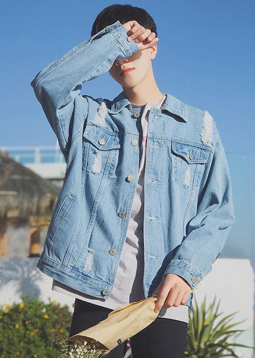 Quần jean nam ống rộng phối áo thun với áo khoác jean cho anh em thích phong cách Hàn Quốc