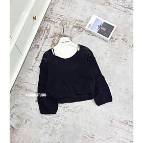 Áo len nữ 2 món gồm áo dây mặc trong và áo len móc lỗ dáng ngắn mặc ngoài. Thiết kế đơn giản, dễ phối với nhiều kiểu trang phục khác nhau. Chất len co