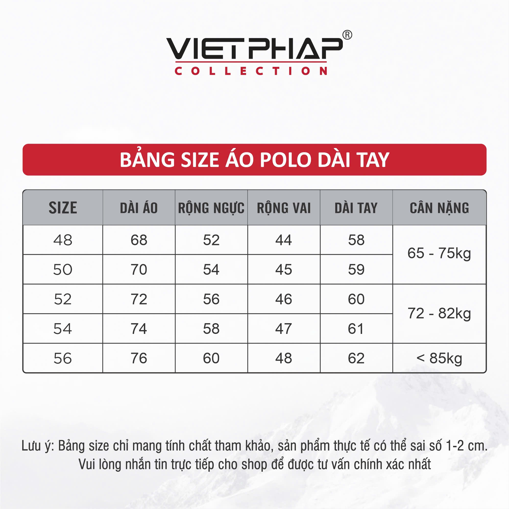 Áo Thun Polo dài tay VIỆT PHÁP cao cấp mềm mại thoáng khí - Chất liệu: 55% Cotton - 35% Polyester - 10% Silk - Size: 48 - 50 - 52 - 54 - 56 - Màu: Đen - Xanh