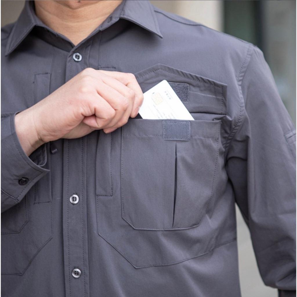 Áo sơ mi chiến thuật co giãn_nhanh khô được chế tạo đến 4 ngăn túi áo, được chia gồm 2 túi áo ngực và 1 túi bắp tay. Với túi áo ngực được thiết kế