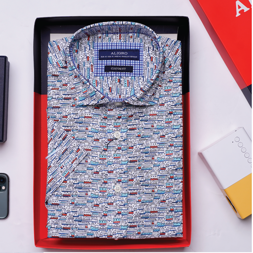 Áo SƠ MI NAM CỘC TAY HỌA TIẾT XANH ALIGRO ALGS-C88