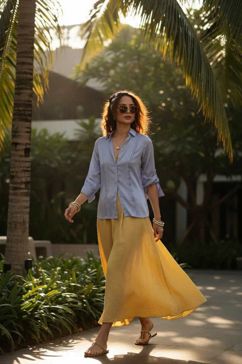 - Công sở hiện đại: Kết hợp hoàn hảo với chân váy linen màu vàng Golden Sand để tạo nên bộ đôi tương phản nổi bật. Sơ vin áo gọn gàng để khoe vòng eo và tạo phom dáng thon thả.