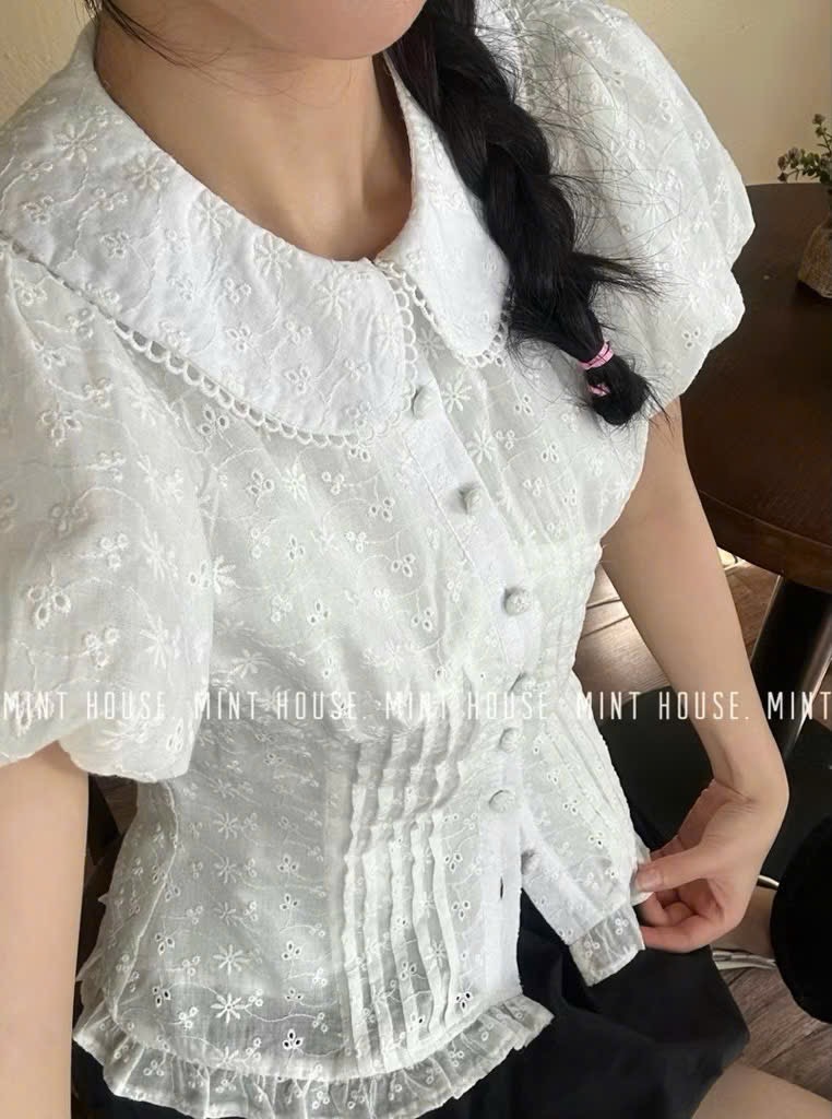 CHI TIẾT SẢN PHẨM - Sản phẩm : Áo sơ mi kiểu tay phồng dễ thương nữ tính thích hợp công sở Garnet Miều Est.2013 - Chất liệu : Xô Ren - Màu sắc :