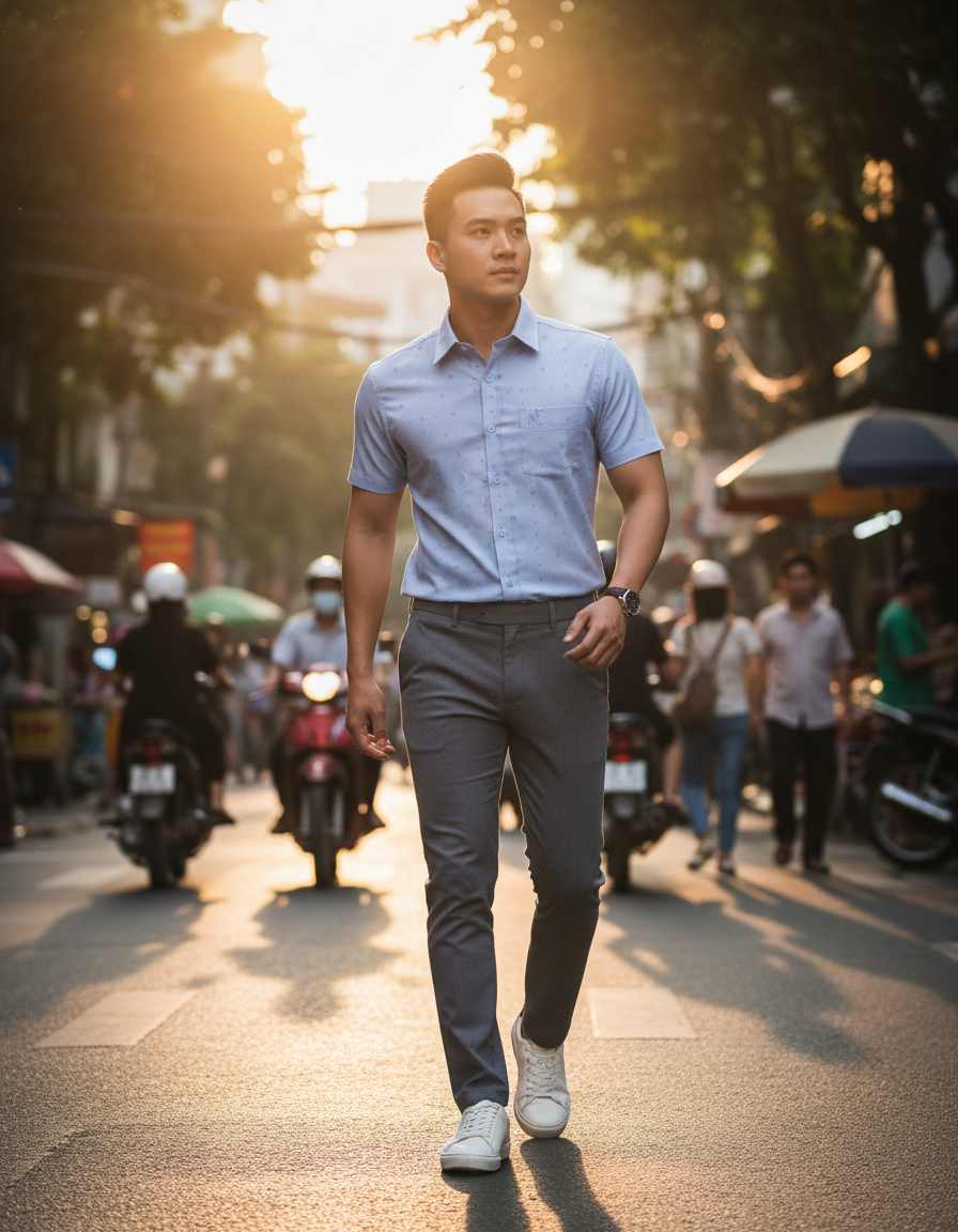 Phom regular vừa vặn, giúp người mặc gọn gàng, lịch sự.