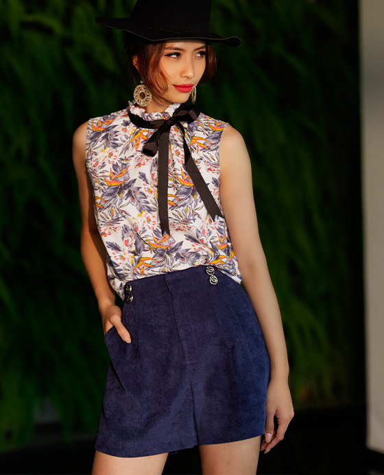 Áo kiểu dáng suông Không tay Cổ cao viền bèo, ruy băng gân viền thắt nơ cổ Cài bằng nút phía sau Chất liệu chính: Polyester Ruy băng gân Polyester Cắt may thủ công tinh