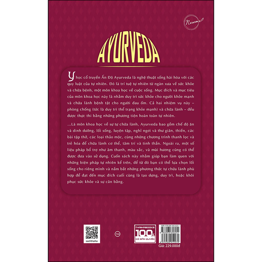 Là môn khoa học về sự tự chữa lành, Ayurveda bao gồm chế độ ăn và dinh dưỡng, lối sống, việc luyện tập, nghỉ ngơi và thư giãn, thiền định, các bài tập thở, các loại thảo mộc, cùng những chương trình thanh lọc và trẻ hóa để chữa lành cơ thể, tâm trí và tinh thần. Ngoài ra, một số liệu pháp bổ trợ như âm thanh, màu sắc và mùi hương cũng có thể được đưa vào sử dụng. Cuốn sách này nhằm giúp bạn làm quen với những biện pháp tự nhiên kể trên, để từ đó bạn có thể lựa chọn lối sống cho riêng mình và nắm bắt những phương thức tự chữa lành phù hợp nhằm đạt đến mục đích cuối cùng là tạo dựng, duy trì hoặc khôi phục sức khỏe và sự cân bằng.