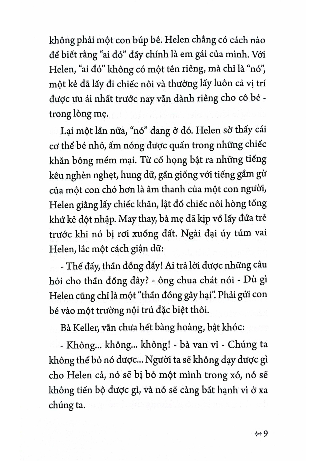 Bà Đại Sứ (PNU) Sau những ngày vật lộn với bệnh viêm màng não vào năm lên hai tuổi, Helen Keller đã hoàn toàn bị điếc, câm, mù. Tương lai tưởng chừng như đen tối