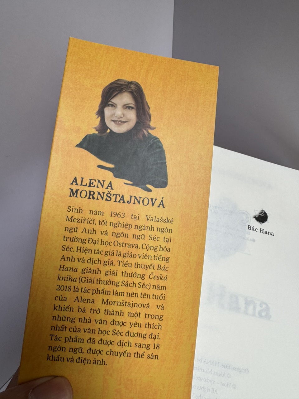 Về tác giả: Alena Mornštajnová  sinh năm 1963 tại Valašské Meziříčí, tốt nghiệp ngành ngôn ngữ Anh và ngôn ngữ Séc tại trường Đại học Ostrava, Cộng hòa Séc. Hiện tác giả là giáo viên tiếng Anh và dịch giả. Tiểu thuyết Bác Hana giành giải thưởng Česká kniha (Giải thưởng Sách Séc) năm 2018 là tác phẩm làm nên tên tuổi của Alena Mornštajnová và khiến bà trở thành một trong những nhà văn được yêu thích nhất của văn học Séc đương đại. Tác phẩm đã được dịch sang 18 ngôn ngữ, được chuyển thể sân khấu và điện ảnh.