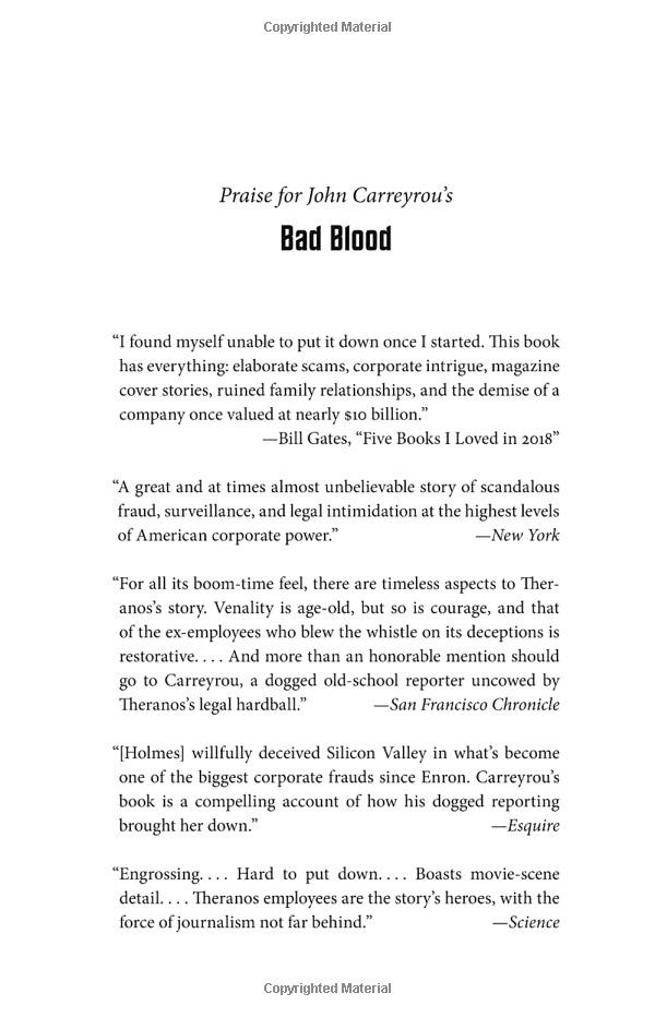 Rigorously reported and fearlessly written, Bad Blood is a gripping story of the biggest corporate fraud since Enron--a tale of ambition and hubris set amid the bold promises of Silicon Valley.