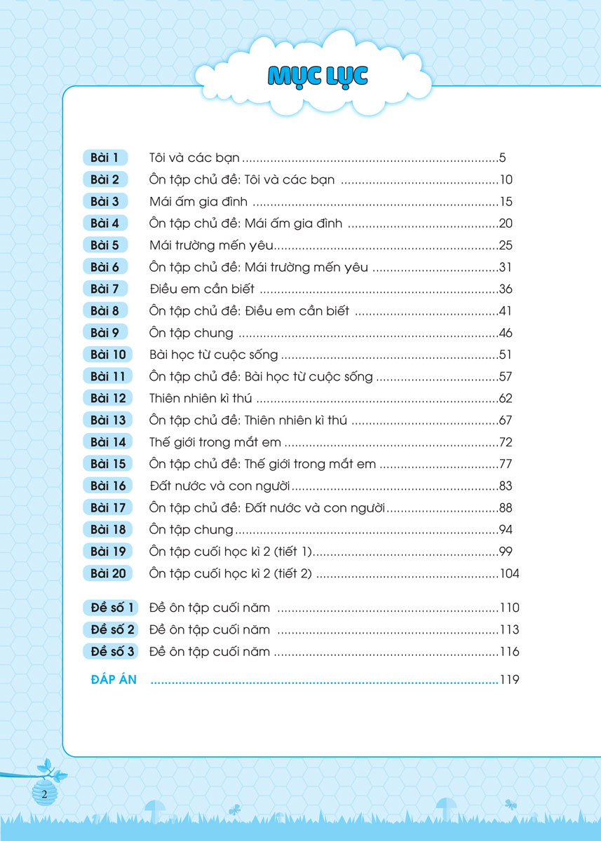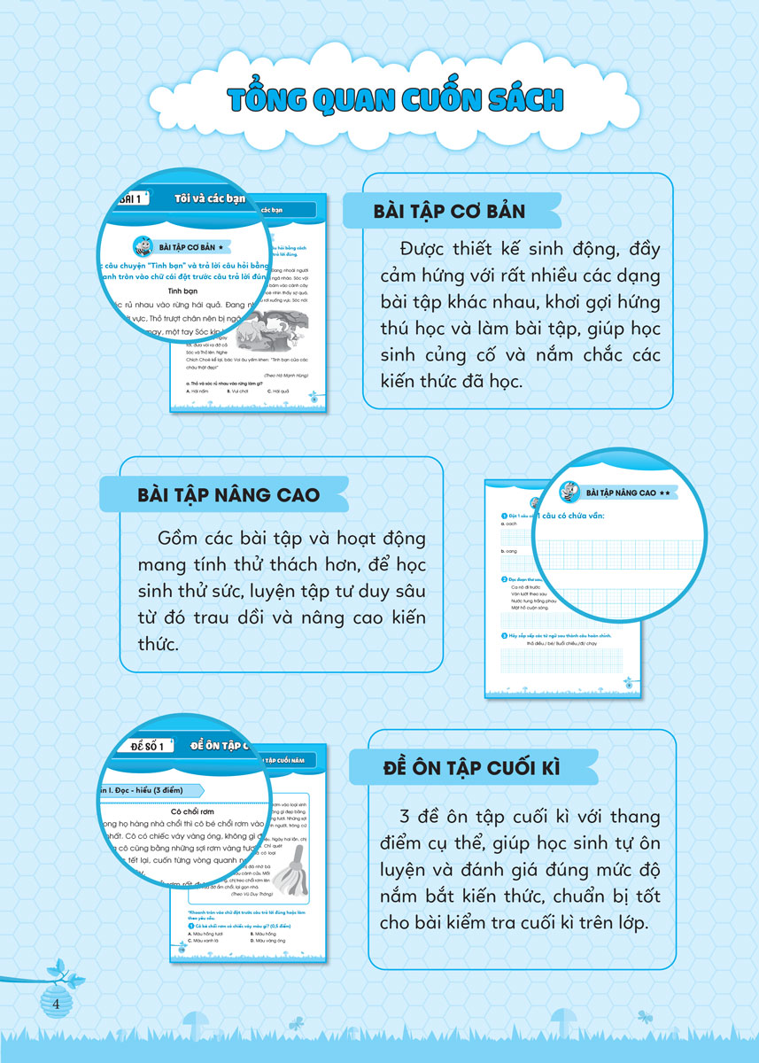 Cuốn sách cũng cung cấp 3 đề ôn tập cuối kì với thang điểm cụ thể, để các em tự ôn luyện và đánh giá đúng mức độ nắm kiến thức, chuẩn bị tốt kiến thức và tâm lý cho bài kiểm tra cuối kì trên lớp.