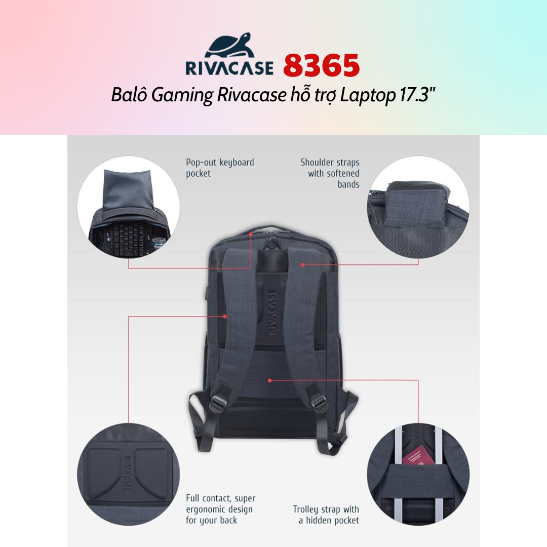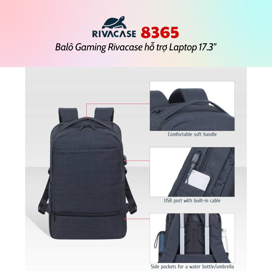 Rivacase 8365 được chú trọng từng chi tiết và đi kèm với một loạt các tính năng mang đến cho người dùng sự thoải mái và tiện lợi. Mặt bên ba lô được trang bị cổng USB dùng để cắm sạc pin các thiết bị di động trong khi di chuyển. Tay cầm, dây đeo vai êm, mềm mại, tạo cảm giác thoải mái cho người dùng trong suốt quá trình đeo và sử dụng. Thêm vào đó, mặt sau ba lô được thiết kế tiện dụng mang lại sự thông thoáng dễ chịu cùng với dây đeo hành lý xe đẩy giúp người dùng dễ dàng di chuyển.