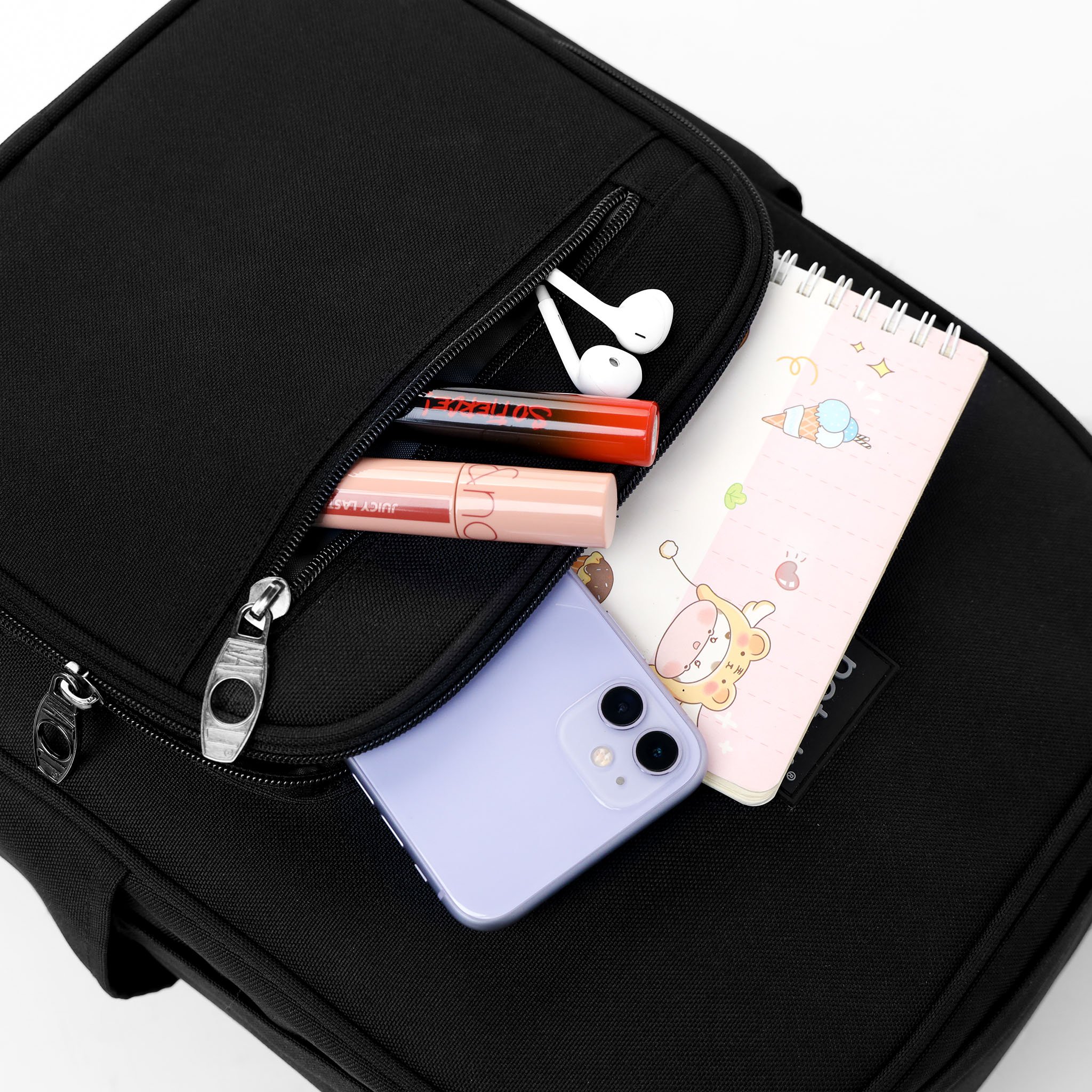 • Ngăn phía trước chia thành 2 ngăn: Ngăn lớn: đựng sổ tay, dây sạc, gương lược - Ngăn nhỏ: đựng son môi, thẻ xe, tai nghe,