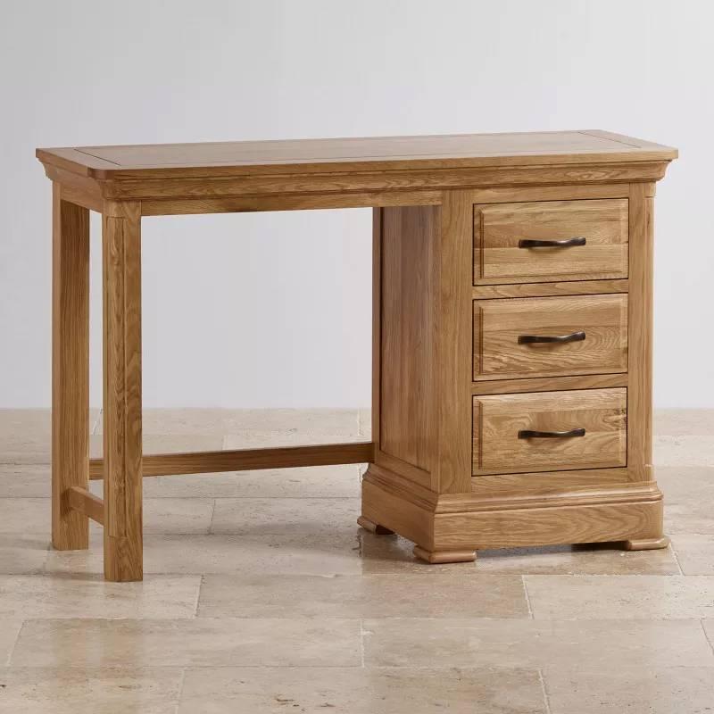 Bàn trang điểm 3 ngăn kéo Canterbury được làm từ gỗ sồi trắng Mỹ nhập khẩu có độ bền cao với tông màu tươi sáng và ấm áp. Đây sẽ là mảnh ghép hoàn hảo cho bất kì phong cách phòng ngủ nào. Ba ngăn kéo được làm thủ công, kết cấu chắc chắn, dùng để lưu trữ những đồ dùng trang điểm và các phụ kiện cần thiết khác. Chiếc bàn mang một vẻ ngoài tuyệt đẹp, với tay cầm kim loại màu đen ấn tượng và các yếu tố thiết kế lấy cảm hứng từ đồ nội thất truyền thống. Sản phẩm mang đặc trưng của bộ sưu tập Canterbury như chi tiết cắt góc tròn cạnh tinh tế và các mặt ngăn kéo giật cấp cổ điển tăng thêm phần nổi bật. Đừng quên phối hợp mẫu ghế cùng bộ sưu tập để tạo sự đồng bộ và hài hòa cho thiết kế này.