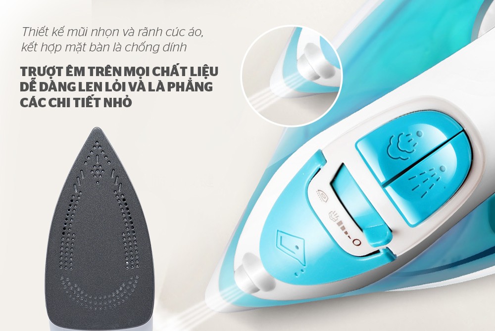 Mặt bàn là chống dính, phù hợp mọi chất liệu Bề mặt bàn là được phủ lớp chống dính siêu bền, giúp bàn là trượt êm trên mọi chất liệu, tránh làm cháy xém quần áo. Kết hợp với lỗ thoát hơi nước cực mạnh giúp là phẳng nếp nhăn trên mọi loại vải. Ngoài ra, mũi bàn là nhọn giúp len lỏi tốt vào các vùng ủi hẹp như cổ áo, hai hàng cúc, nách áo… Đèn hiển thị thông minh Bàn là còn được trang bị thêm một đèn hiển thị. Khi bạn cắm phích cắm vào ổ điện thì đèn sẽ sáng lên và phải đợi cho đến khi đèn tắt đi tức là nước trong bàn là đã đủ nóng để bạn có thể sử dụng. LÀ PHẲNG NẾP NHĂN TRÊN MỌI LOẠI VẢI