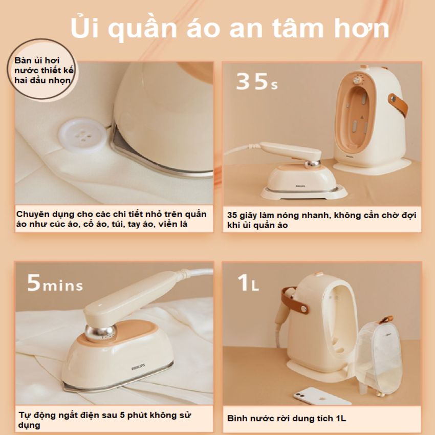 Thiết kế nhỏ gọn, dễ thao tác, phù hợp để mang theo khi đi du lịch, công tác. Phần đầu ủi có thể điều chỉnh tạo góc nghiêng tiện lợi, có thể ủi theo chiều