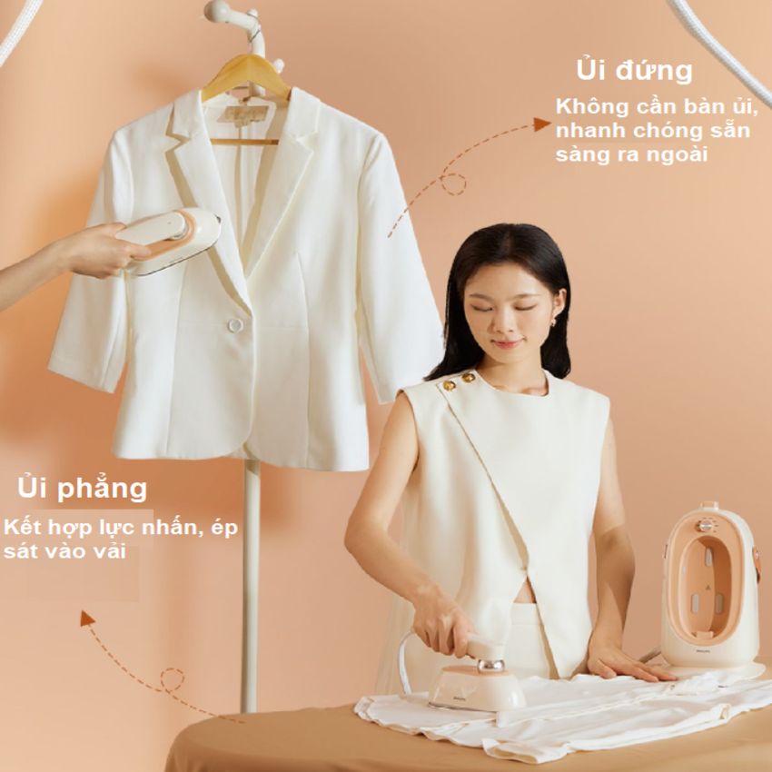 Hơi phun tăng cường lên tới 250 g giúp làm phẳng cả những nếp nhăn cứng đầu: Thâm nhập sâu hơn vào cấu trúc vải để loại bỏ ngay cả những nếp nhăn cứng đầu.