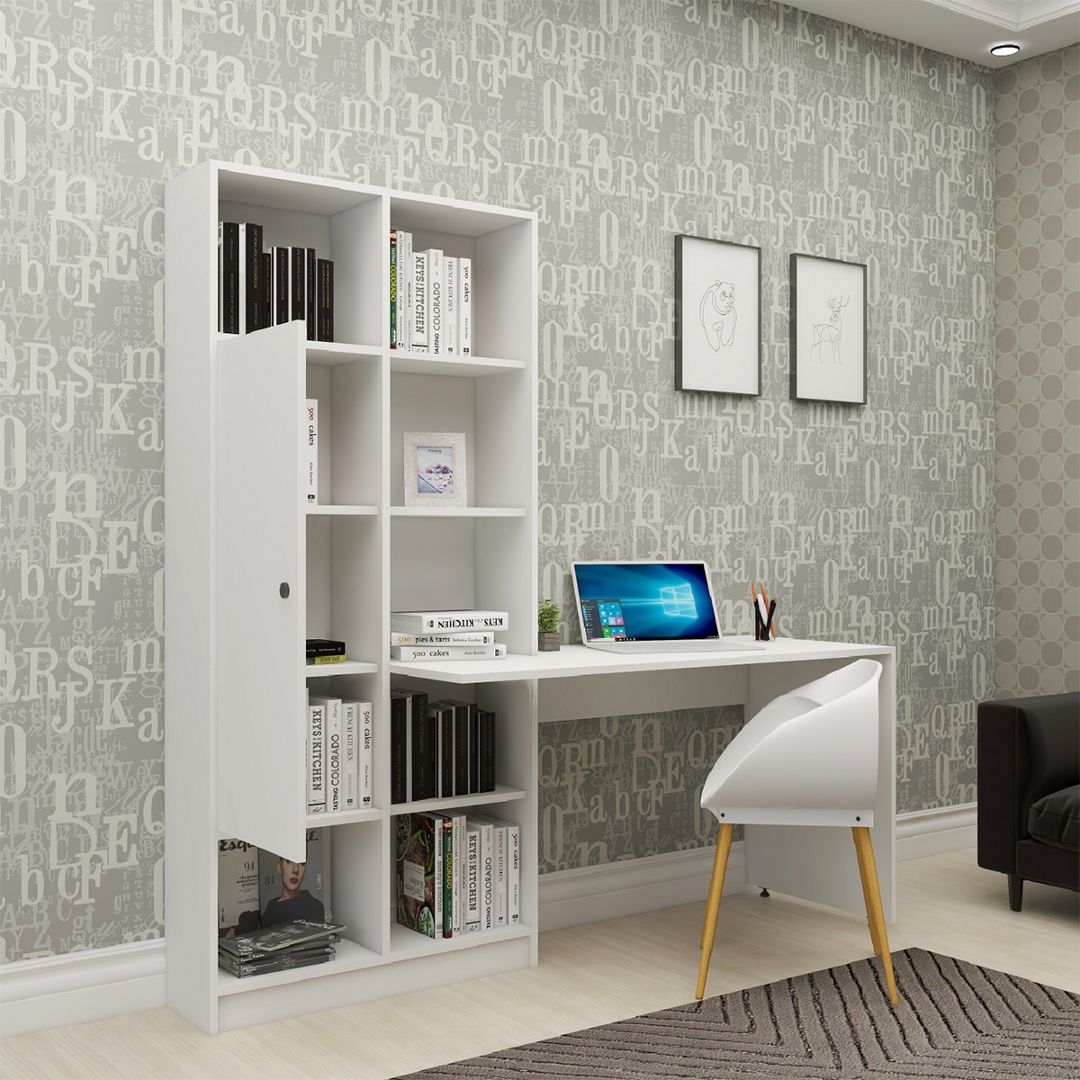 - Tên sản phẩm: Bàn làm việc IGA kèm kệ sách decor phong cách minimalism - Màu sắc: Trắng - Chất liệu: Chân thép phủ sơn tĩnh điện, mặt gỗ mdf phủ melamin chống xước