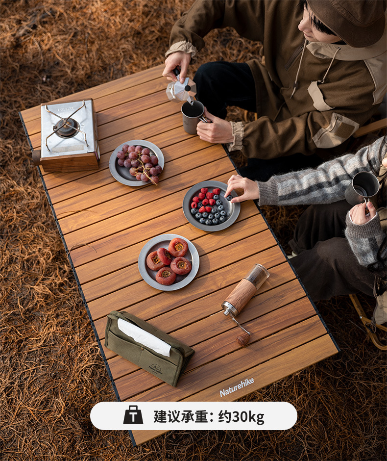 NatureHike CNH22JU038 chất liệu hợp kim nhôm vân gỗ nhẹ, bền và vô cùng sang trọng. Thiết kế khung bàn chữ X hỗ trợ ổn định hơn, tải trọng cao tới 30kg. Khung bàn có thể