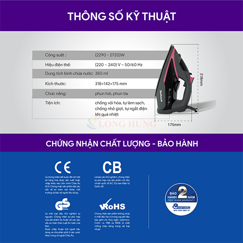 THÔNG SỐ KỸ THUẬT - Loại bàn ủi: Bàn là hơi nước - Công suất: 2000W - Bình nước: 220 ml - Mặt đế: Ceramic chống dính - Chức năng: Ủi khô Ủi hơi nước