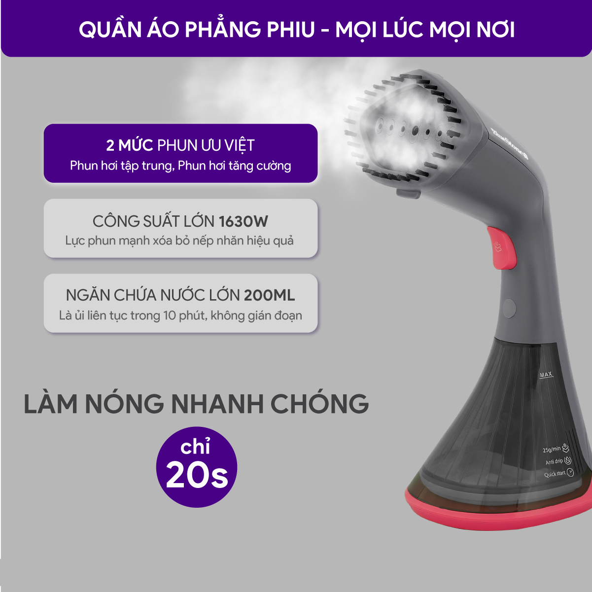 • Thiết kế nhỏ gọn có thể dễ dàng mang theo đi du lịch • Độ hoàn thiện sắc sảo • Luồng hơi nước mạnh mẽ, làm phẳng mọi nếp nhắn hiệu quả • Nước