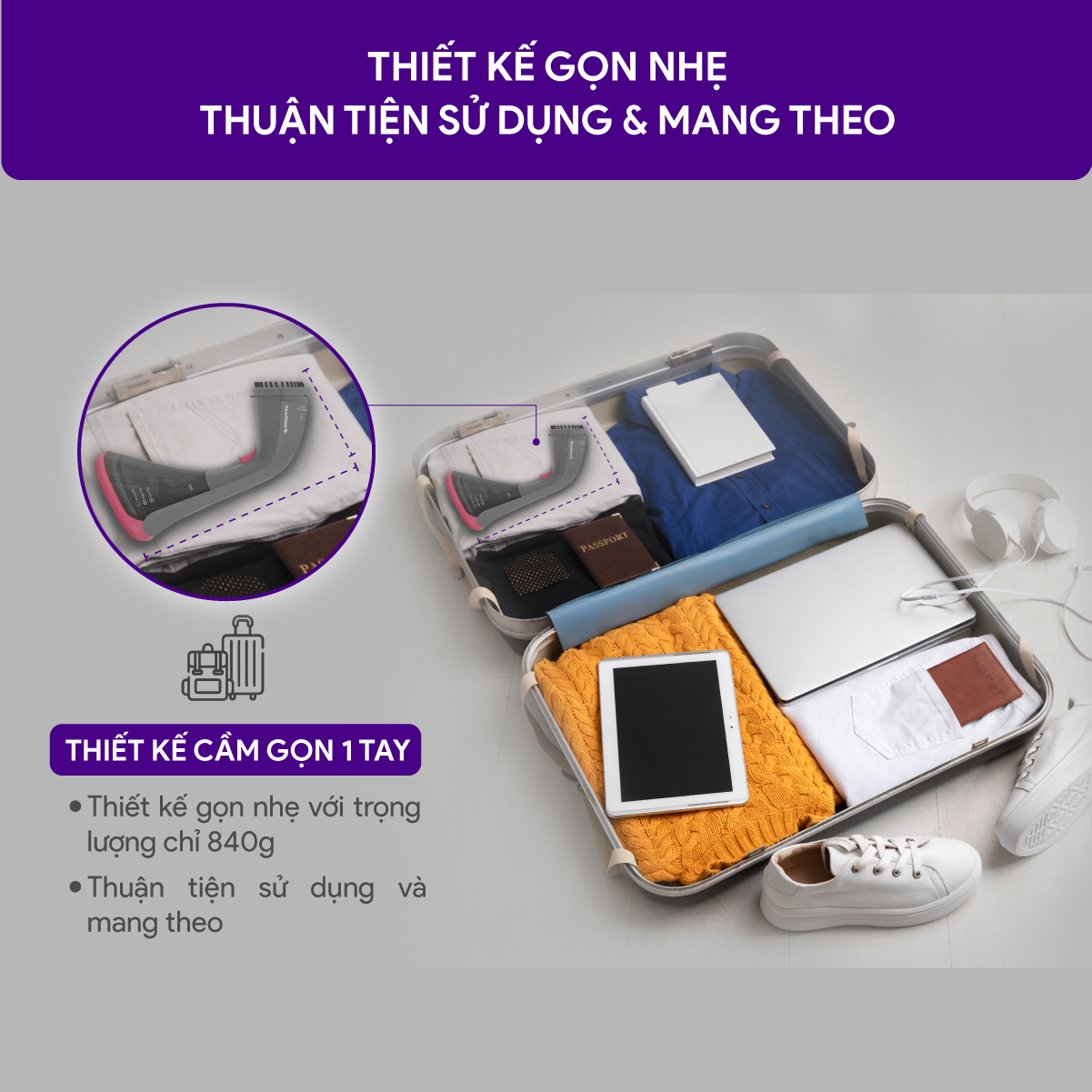 Thiết kế nhỏ gọn, dễ thao tác, phù hợp để mang theo khi đi du lịch, công tác. Phần đầu ủi có thể điều chỉnh tạo góc nghiêng tiện lợi, có thể ủi theo chiều