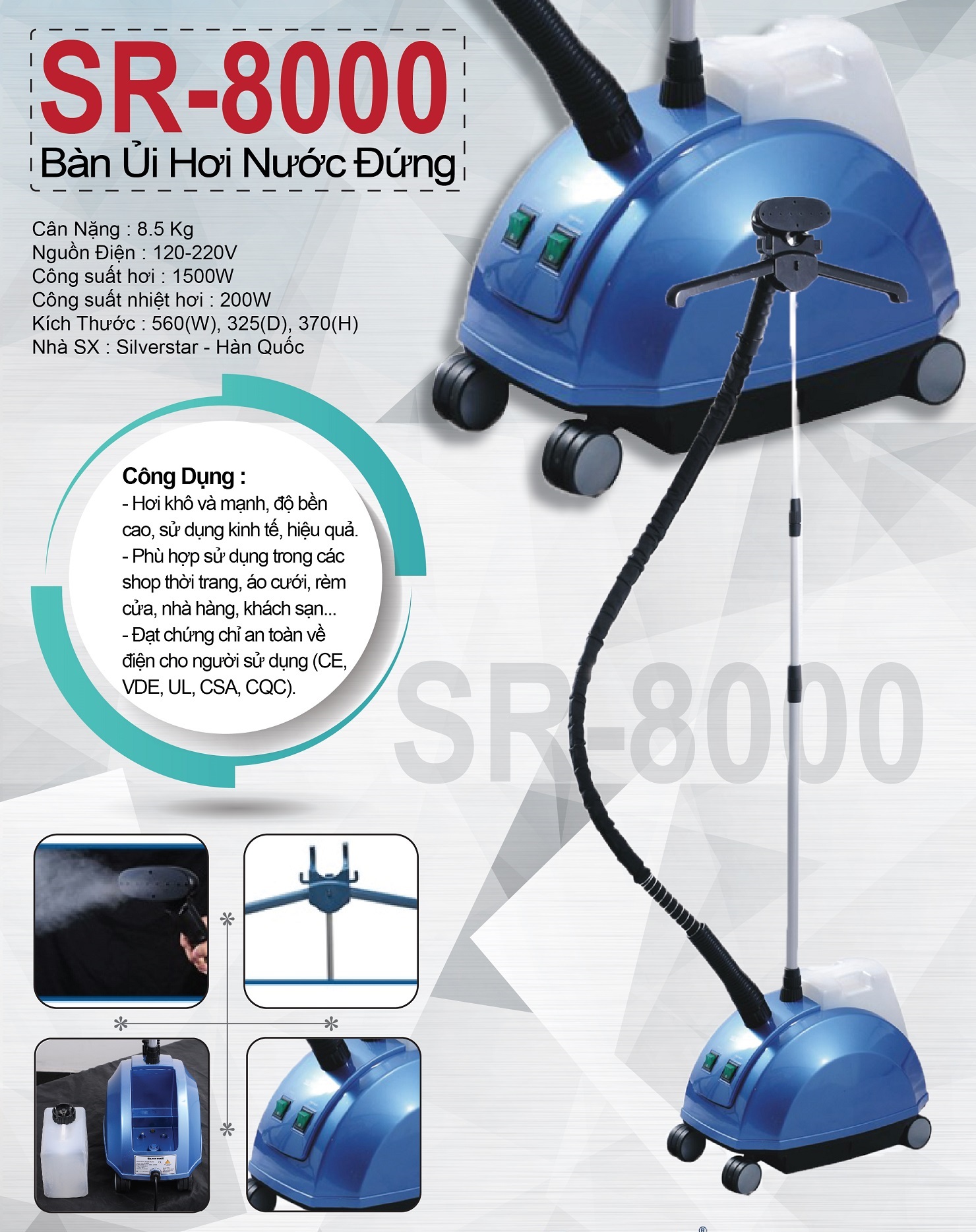 BÀN ỦI HƠI NƯỚC ĐỨNG SR-8000 SILVER STAR- Sử dụng ủi là quần áo, áo cưới, rèm màn cửa....- Lượng hơi nhiệt nóng phun liên tục, đều và mạnh mẽ- Sử dụng cho gia đình, shop thời trang, áo cưới, showroom,...