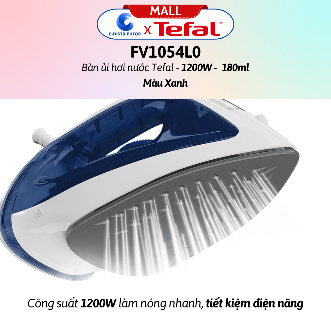 Mặt đế Ceramic chống dính di chuyển mượt mà trên mặt vải Thông số kỹ thuật Bàn ủi hơi nước Tefal FV1054L0 Loại bàn ủi: Bàn ủi hơi nước Chiều dài dây dẫn: 1.8 mét Chất liệu đế : Ceramic Công suất : 1200W Dung tích bình nước: 180 ml Thiết kế nhỏ gọn, màu sắc bắt mắt Bàn ủi hơi nước Tefal FV1054L0 có thiết kế nhỏ gọn, chất liệu bền tốt. Dây điện dài 1.8m tiện di chuyển trong quá trình ủi. Công suất hoạt động 1200W giúp tiết kiệm điện năng hiệu quả. Mặt đế Ceramic chống dính lướt êm ái trên mặt vải Bàn ủi Tefal FV1054L0 có mặt đế Ceramic chống dính, hạn chế trầy xước, lướt êm ái trên mặt vải để ủi quần áo nhanh hơn. Dung tích bình chứa nước 180 ml Bàn ủi hơi nước Tefal FV1054L0 có dung tích chứa nước là 180 ml để bạn ủi được nhiều quần áo hơn khoảng 2 - 3 bộ quần áo (tùy vào độ nhăn và chất liệu vải) cùng với chế độ phun hơi và phun tia nước giúp làm phẳng các vết nhăn cứng đầu hiệu quả.Lưu ý: chỉ nên dùng nước sạch không đổ thêm tinh dầu hay nước hoa vào để hạn chế đóng cặn và gây hư hỏng cho bàn ủi. Hơi phun tăng cường giúp ủi phẳng nếp nhăn cứng đầu Hơi phun tăng cường 80g ủi các vết nhăn khó nhằn giúp bạn tiết kiệm thời gian ủi đồ và rãnh tay làm các công việc khác. Ngoài ra, bạn cũng có thể tùy chỉnh mức phun hơi phù hợp theo nhu cầu sử dụng với từng loại quần áo khác nhau.