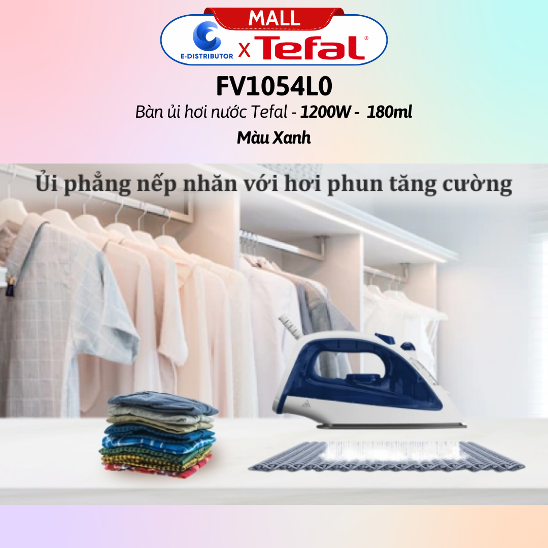 THÔNG TIN SẢN PHẨM Bàn ủi hơi nước Tefal FV1054L0 1200W (Màu Xanh) Đặc điểm nổi bật - Thiết kế nhỏ gọn, dễ di chuyển, hạn chế mỏi tay - Công suất 1200W làm nóng nhanh, tiết kiệm điện năng - Dung tích bình nước 180 ml ủi được nhiều quần áo cùng lúc - Hơi phun tăng cường 80g ủi các vết nhăn khó nhằn - Mặt đế Ceramic chống dính di chuyển mượt mà trên mặt vải Thông số kỹ thuật Bàn ủi hơi nước Tefal FV1054L0 Loại bàn ủi: Bàn ủi hơi nước Chiều dài dây dẫn: 1.8 mét Chất liệu đế : Ceramic Công suất : 1200W Dung tích bình nước: 180 ml Thiết kế nhỏ gọn, màu sắc bắt mắt Bàn ủi hơi nước Tefal FV1054L0 có thiết kế nhỏ gọn, chất liệu bền tốt. Dây điện dài 1.8m tiện di chuyển trong quá trình ủi. Công suất hoạt động 1200W giúp tiết kiệm điện năng hiệu quả. Mặt đế Ceramic chống dính lướt êm ái trên mặt vải Bàn ủi Tefal FV1054L0 có mặt đế Ceramic chống dính, hạn chế trầy xước, lướt êm ái trên mặt vải để ủi quần áo nhanh hơn. Dung tích bình chứa nước 180 ml Bàn ủi hơi nước Tefal FV1054L0 có dung tích chứa nước là 180 ml để bạn ủi được nhiều quần áo hơn khoảng 2 - 3 bộ quần áo (tùy vào độ nhăn và chất liệu vải) cùng với chế độ phun hơi và phun tia nước giúp làm phẳng các vết nhăn cứng đầu hiệu quả.Lưu ý: chỉ nên dùng nước sạch không đổ thêm tinh dầu hay nước hoa vào để hạn chế đóng cặn và gây hư hỏng cho bàn ủi. Phun tăng cường giúp ủi phẳng nếp nhăn cứng đầu Hơi phun tăng cường 80g ủi các vết nhăn khó nhằn giúp bạn tiết kiệm thời gian ủi đồ và rãnh tay làm các công việc khác. Ngoài ra, bạn cũng có thể tùy chỉnh mức phun hơi phù hợp theo nhu cầu sử dụng với từng loại quần áo khác nhau.THÔNG TIN SẢN PHẨM Thông số kỹ thuật Bàn ủi hơi nước Tefal Easy Steam FV1955E0 1400W - Công suất 1400W - Bình nước 220 ml - Mặt đế Ceramic chống dính -